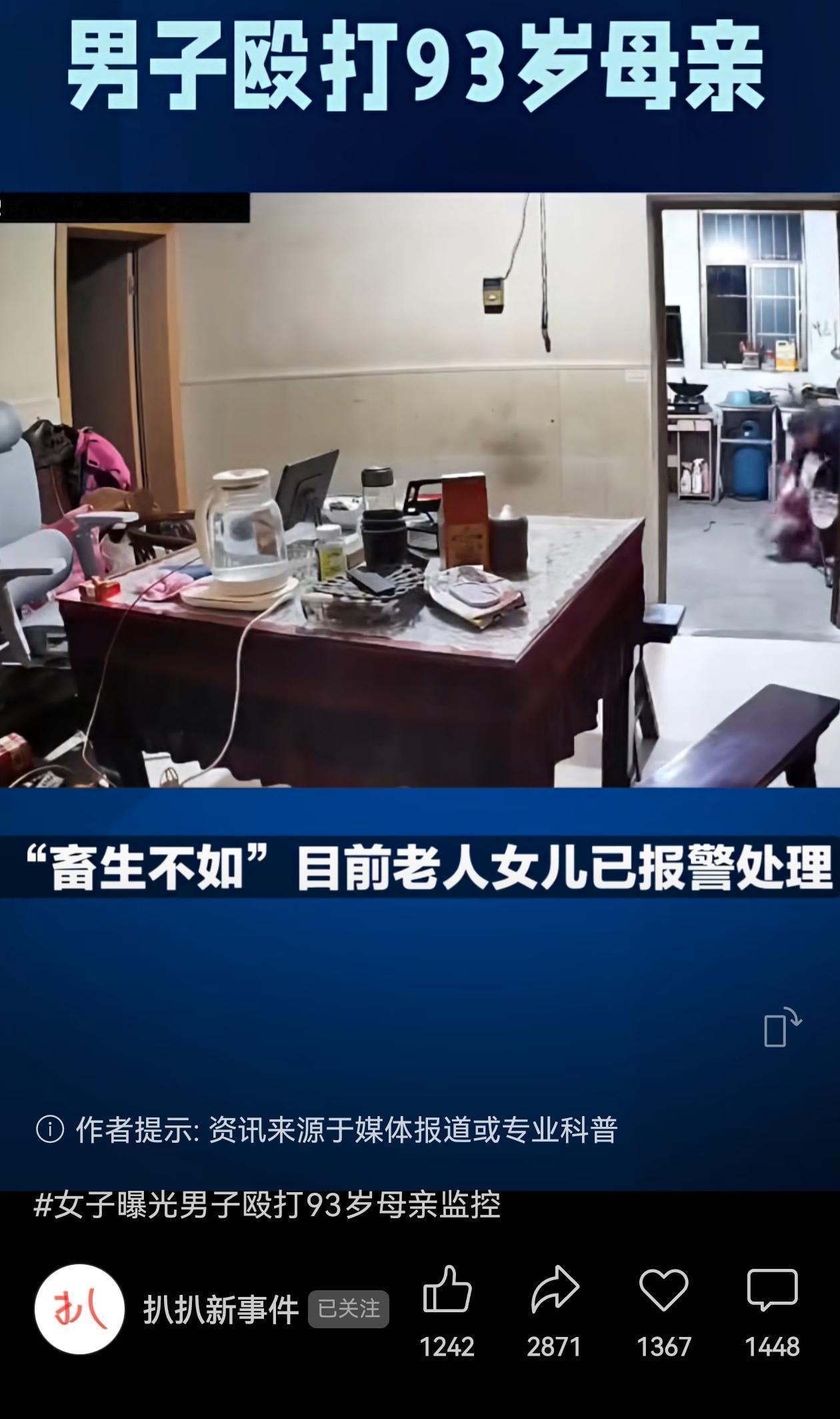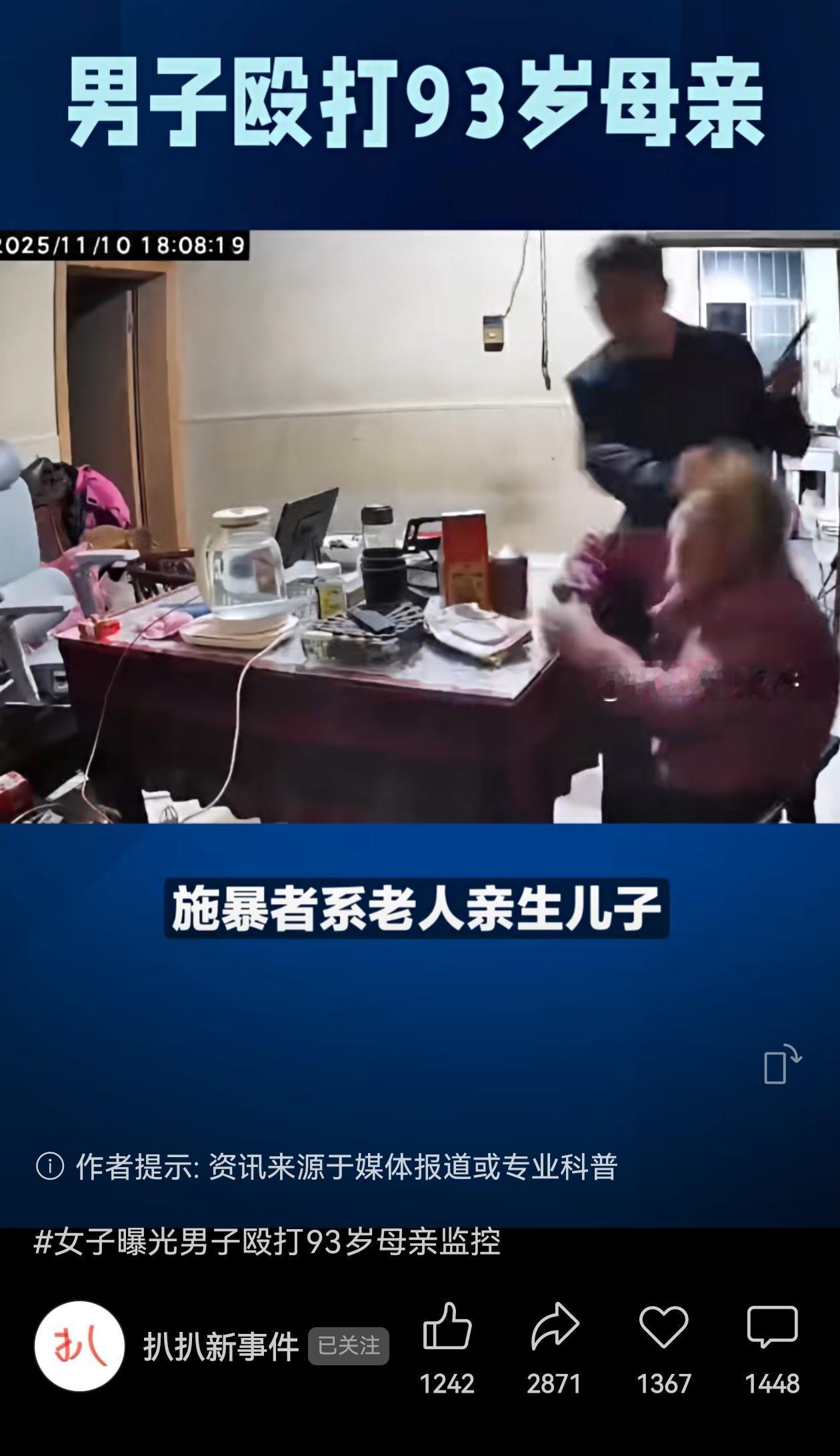 看得人心都揪起来了!“家有一老,如有一宝”,可江苏那个93岁的老母亲,在自己亲儿子这里,换来的不是孝顺,竟然是拳打脚踢!扇耳光、薅头发、按在地上打…… 老人和儿子不知道因为什么争论起来,坐在桌子对面的儿子骂骂咧咧,走到老人旁边,抡起手臂,一巴掌呼在老人嘴上。 老人捂着嘴痛呼出来,儿子还没完,揪起老人的头发对着头乱摔、乱揍、往身上乱踢…… 老人蹒跚着走进厨房躲避,儿子还不放过,追进去,将老人按倒在地,对着老人的头一顿乱揍后任老人躺在地上…… 这可是生他养他的亲妈啊!93岁的高龄,身体还硬朗,这哪是负担,简直是天大的福气!多少家庭羡慕都羡慕不来啊! 可老人养了这种儿子,却遭这种罪。 发布视频的女士说这还不是第一次,老人长期挨打。视频里老人躺在地上一动不动,那个当儿子的却跟没事人一样,又坐在电脑旁边看电脑边吃东西! 女士说已经报警,希望警方介入后老奶奶能平安,晚年能得到善待。 信息来源:扒扒新事件
