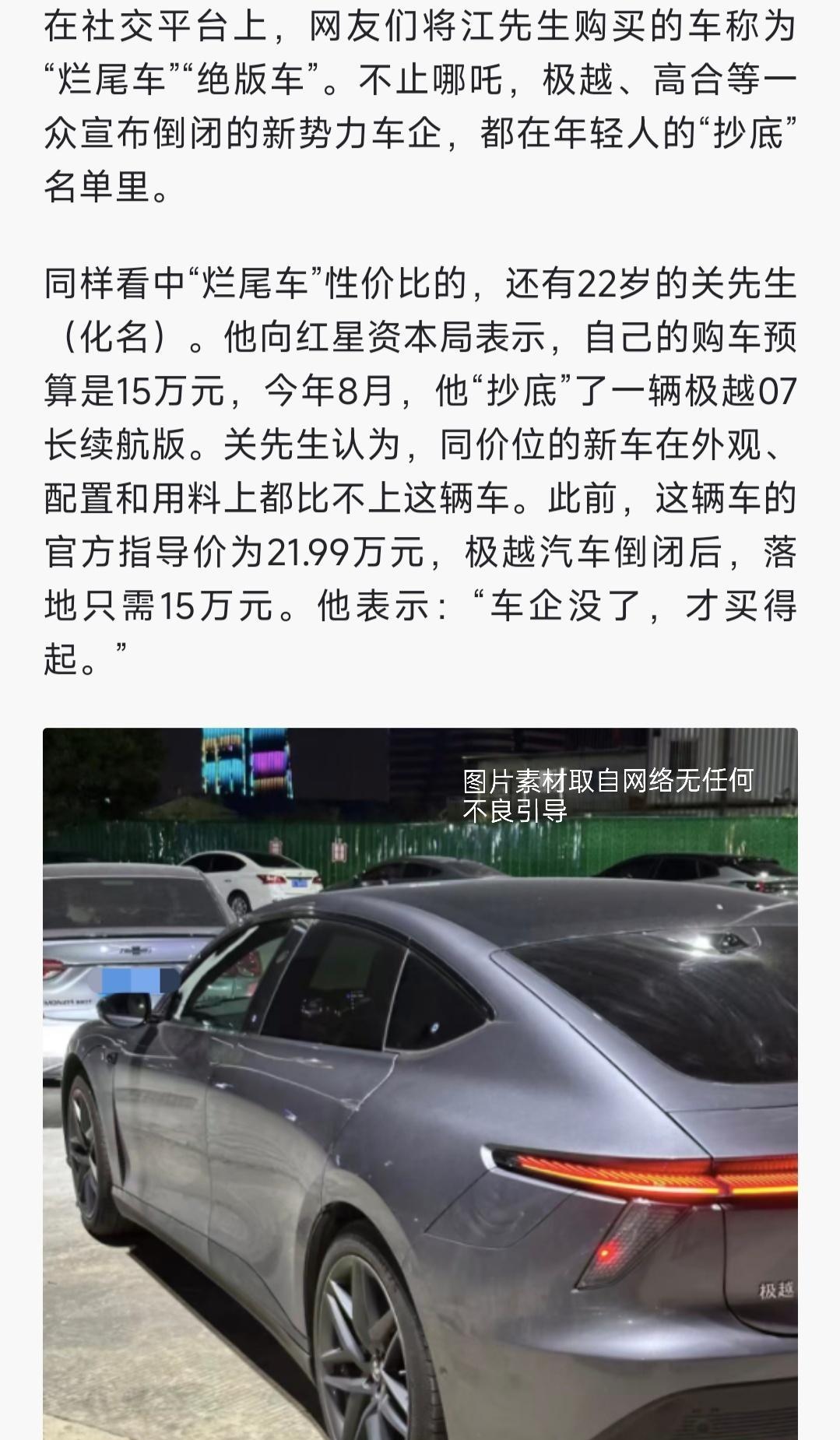 【头条快讯】年轻人掀起“烂尾车”捡漏潮!半价哪吒、12万高合,是精打细算还是豪赌未来? “车企倒闭我才买得起!”这届年轻人开始反向抄底破产车企的库存新车。有人7万拿下原价15万的哪吒,有人12万开走曾卖60万的高合,他们甩出硬核算账逻辑:“开满10万公里直接回本,要啥自行车?” (案例直击)网约车司机道出真相:“威马倒闭后5折购入,跑单半年回血。只要电池不趴窝,小毛病路边修车店全能搞定!”更有哪吒车主发现,虽然终身免流承诺泡汤,但4S店竟还在营业,基础维保仍有保障。 (风险扫描)这类“汽车界临期品”虽香却藏暗雷:车机变砖头、零件断供、保险拒保三大痛点难绕开。业内戏称这是“新能源版俄罗斯轮盘”——赌赢了省下一半钱,赌输了可能连售后电话都打不通。 (专家视角)汽车圈人士点评:电动化降低了养车门槛,电机比发动机耐造,智能配置停更反而让系统更稳定。但这种消费只适合两类人:一是网约车司机等工具型用户,二是精通汽修的硬核玩家。普通家用车主要三思:你愿意为省8万块,天天祈祷爱车别生“疑难杂症”吗? 当下年轻人买车哲学悄然生变:当品牌溢价沦为泡沫,实用主义正在重新定义“性价比”。你会为半价车放弃售后保障吗?评论区已炸锅!