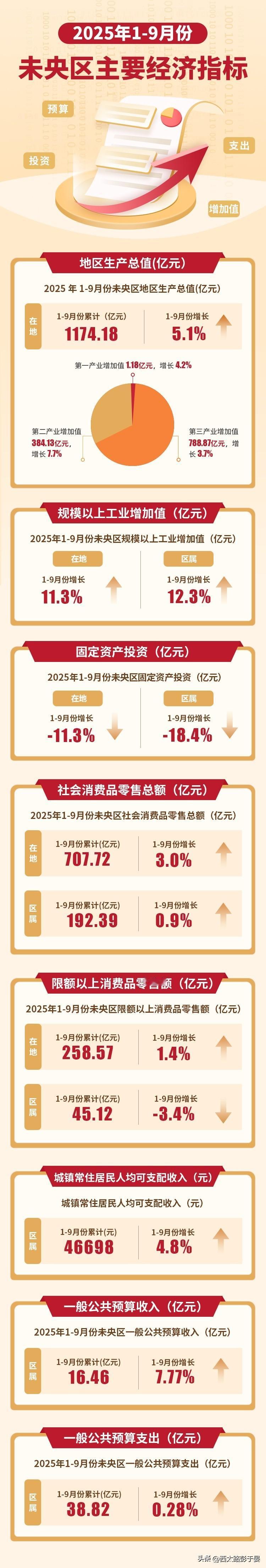 2025年1-9月份未央区主要经济指标的信息如下 地区生产总值:1-9月累计1174.18亿元,增长5.1%。其中第一产业增加值1.18亿元,增长4.2%;第二产业增加值384.13亿元,增长7.7%;第三产业增加值788.87亿元,增长3.7%。 规模以上工业增加值:在地增长11.3%,区属增长12.3%,工业领域呈现增长态势。 固定资产投资:在地增长-11.3%,区属增长-18.4%,投资领域有所下滑。 社会消费品零售总额:在地累计707.72亿元,增长3.0%;区属累计192.39亿元,增长0.9%,消费市场有一定增长。