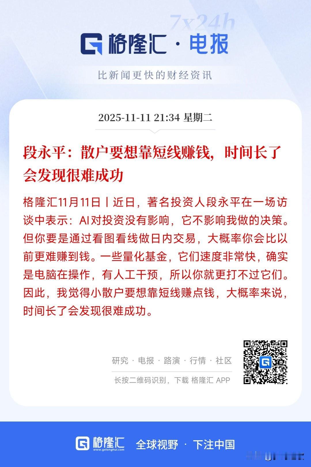 著名投资人表示:不要炒股,炒股散户很难挣到钱 著名投资人表示散户在股市里面很难赚到钱,因为量化基金更容易收割散户。如果想在股市里面赚到钱,要做短线或者投资,但要找好公司,散户不要长时间在股市里面。 事实上,现在A股处于牛市当中,但要赚到钱也要选对板块和个股,此轮牛市也就是科技股的牛市,并不是所有板块都涨,如果买了边缘板块,这轮牛市里面甚至会有亏损。 散户确实容易被收割,但是说长线赚不到钱也不全是,很多有潜力的公司都是要长线拿的,譬如茅台,宁德时代等。