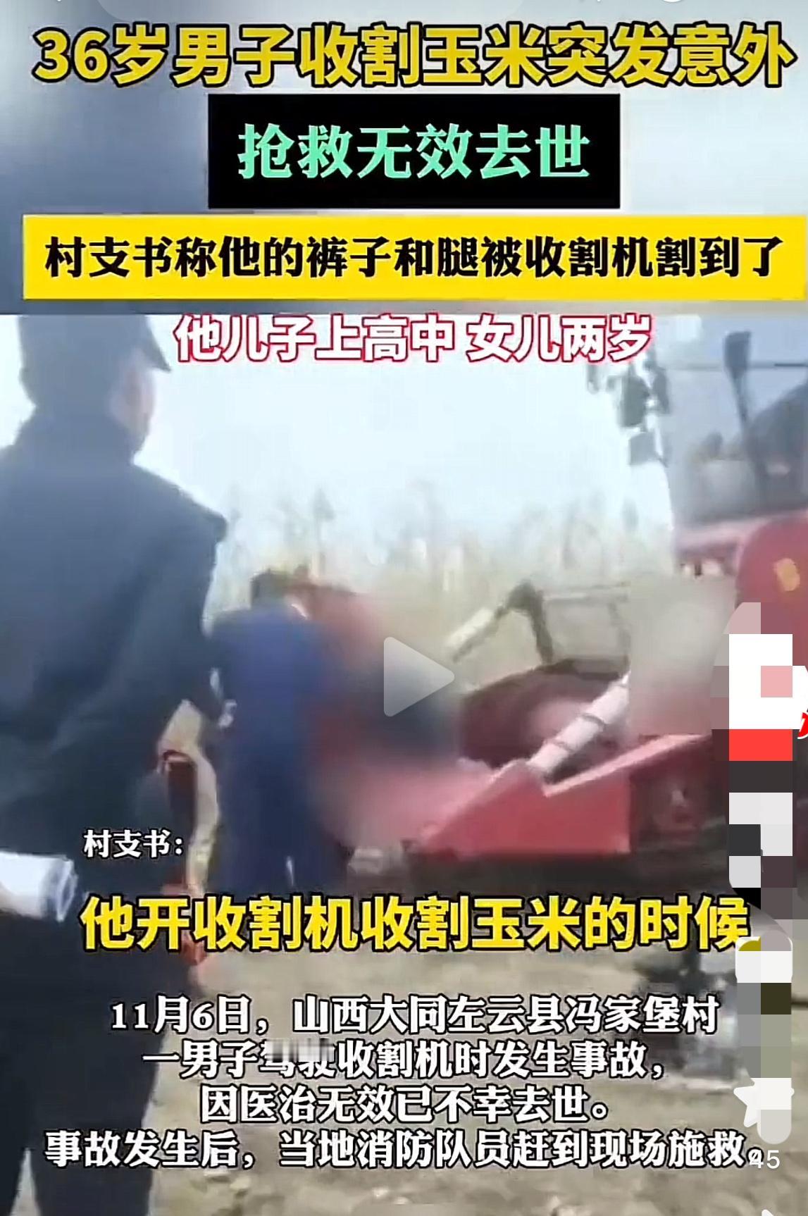 本该是丰收的喜悦, 没想到成了最后的告别, 告诫身边的农耕者,在大型机器面前要有敬畏之心,不要带着侥幸心理,危险无处不在, 山西这个36岁的年轻伙子,在收割玉米时发发生意外,被收割机割到没了性命,36岁正当最美好的年纪啊!多么痛心听到这样的消息。 想起小时候,村里人在收割机工作的时候,很多人跟着后面捡漏,现在想想那些人也是命大,其实真的很危险,对于大型机器工作,我们还是要做好安全防护措施,避免发生意外。