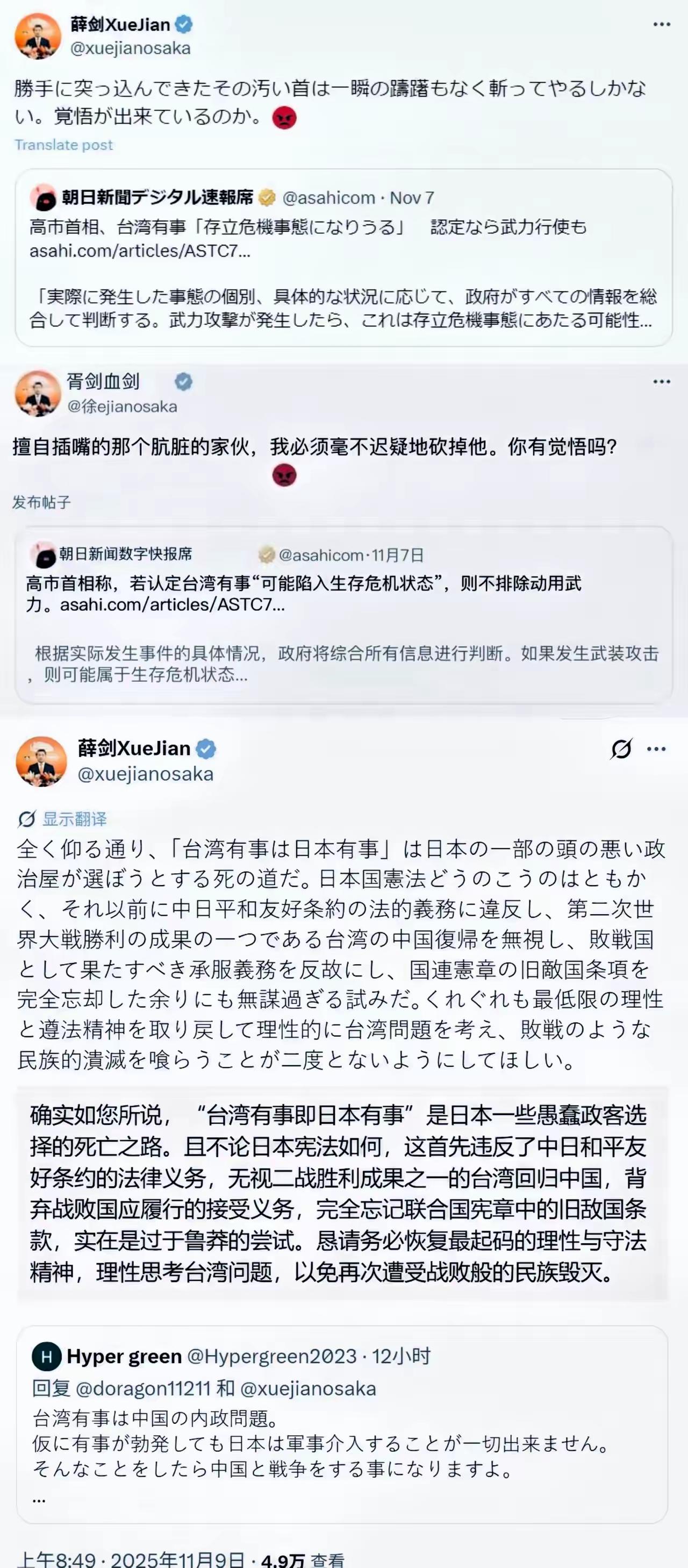 面对国会议员质询“是否收回此前与中国开战的相关言论”,高市早苗还在执迷不悟,死不悔改,准备带领日本,重回军国主义殖民主义的扩张路线。 薛剑总领事说得太对了,日本右翼胆敢插手台海,就得砍了他们的狗头,让他们彻底灭亡! 休与东瀛论雅柔,蛮邦自古少鸿猷。 纵谈声明装痴瞽,妄挑烽烟触逆流。 獐鼠徒劳狂犬吠,雷霆终教妖孽收。 底线分明生死界,何妨挥剑斩倭头! 高市早苗内阁