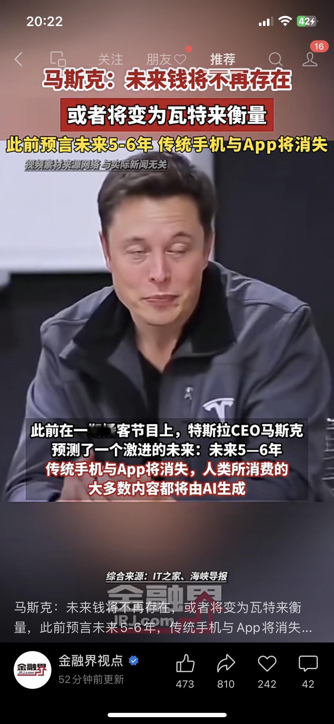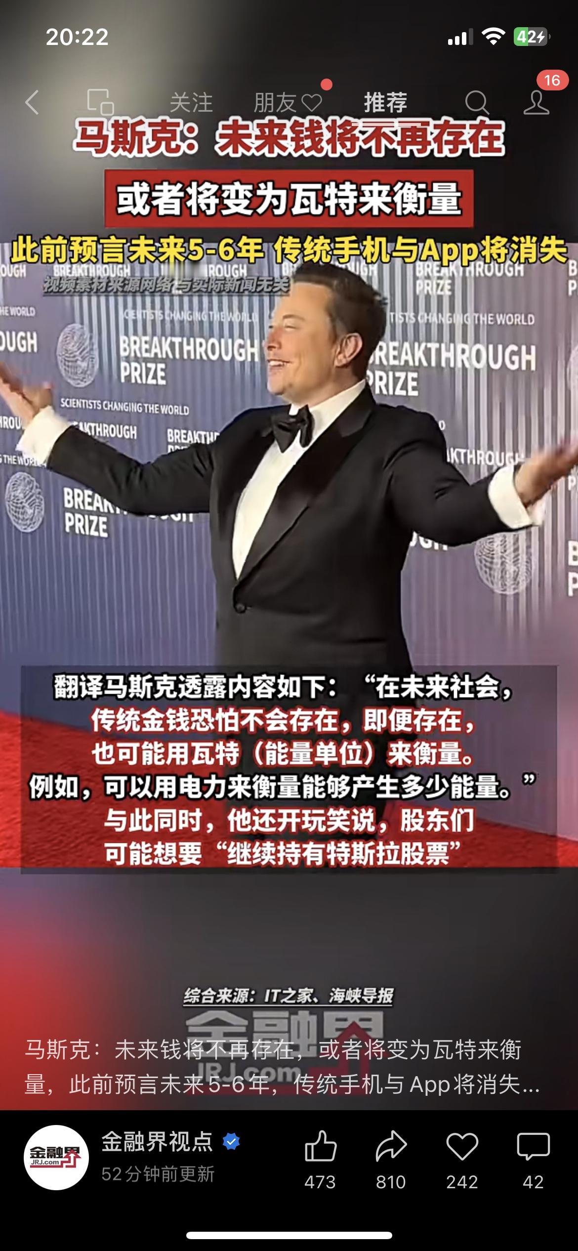 马斯克又疯了?说未来钱会消失! 马斯克又开“脑洞大会”了:说未来“钱会消失”,改用“瓦特(电)”算财富——合着以后买包子得掏“2度电”? 还说5-6年后手机、App全消失,内容全靠AI生成…咱现在刷的抖音,以后是AI直接喂嘴里? 你们信他这鬼话不?我觉得手机消失那天,他特斯拉都得用“电”买车! 转给你身边的“马粉”,让他说说这预言靠谱不!