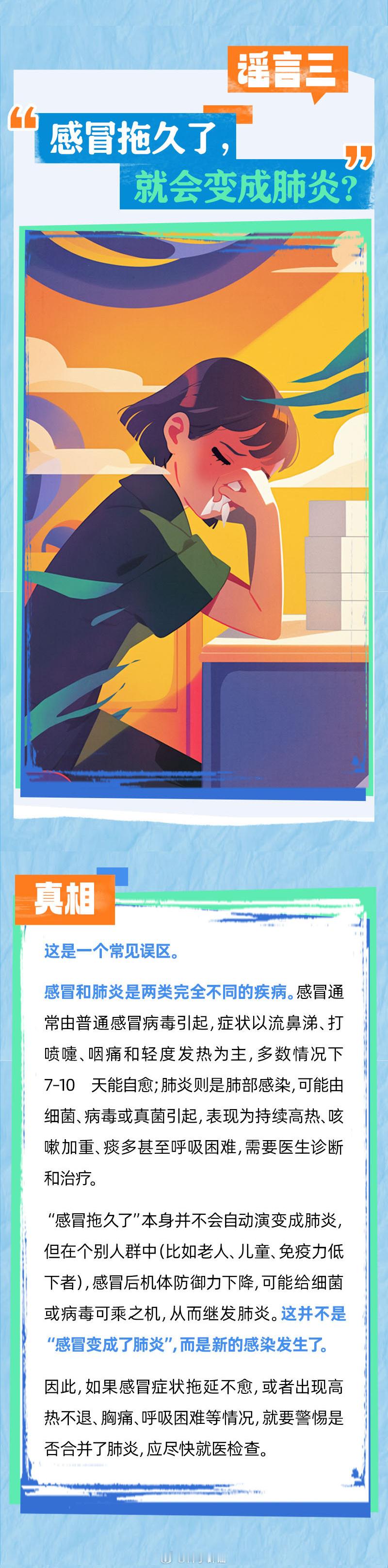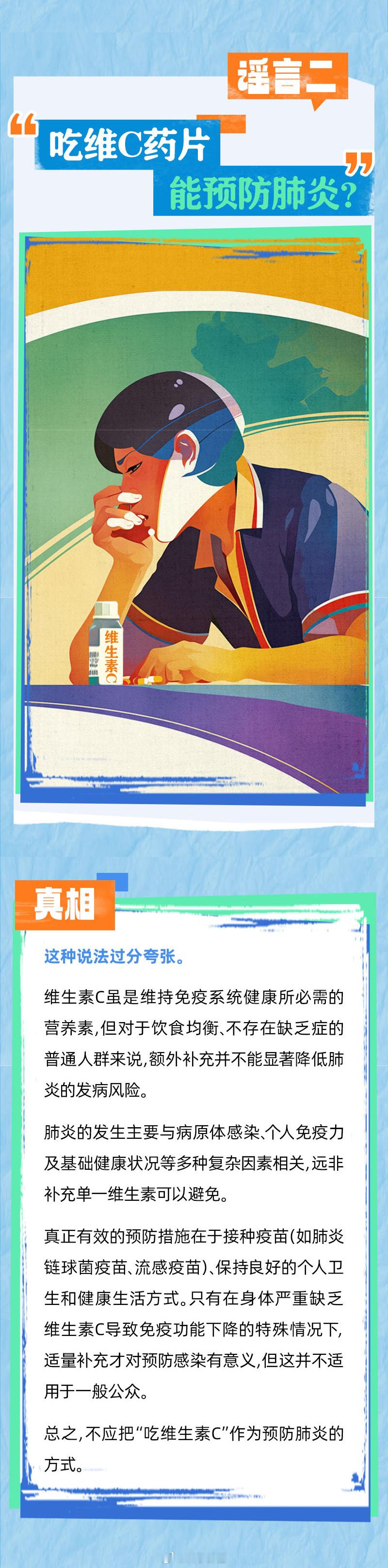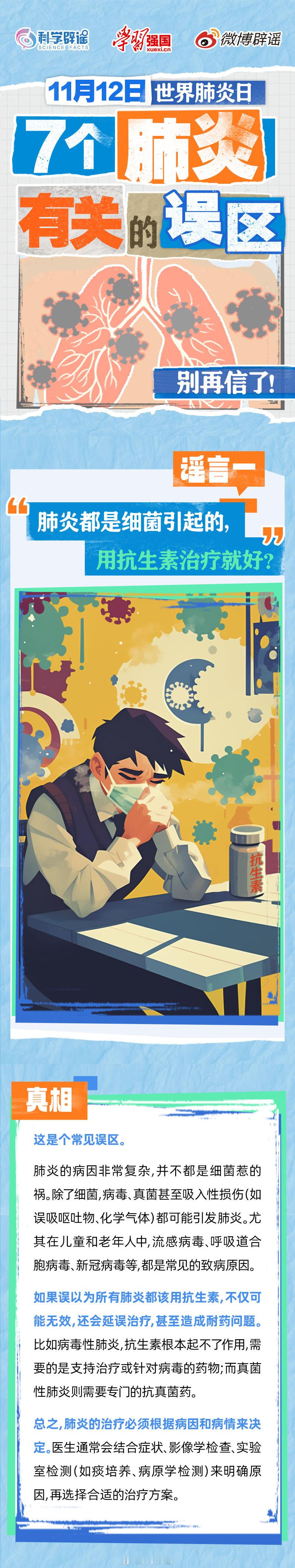 【 别再信了】肺炎都是细菌引起的,用抗生素治疗就好?吃维C药片能预防肺炎?感冒拖久了就会变成肺炎?......这些流传甚广的说法,你听说过吗?今天是, 联合 特别推出「7个肺炎有关的误区,别再信了!」辟谣长图,帮你理清正确认知,别再被错误信息误导啦~ 速戳下图学习👇,转给身边关心的人,一起科学应对肺炎!