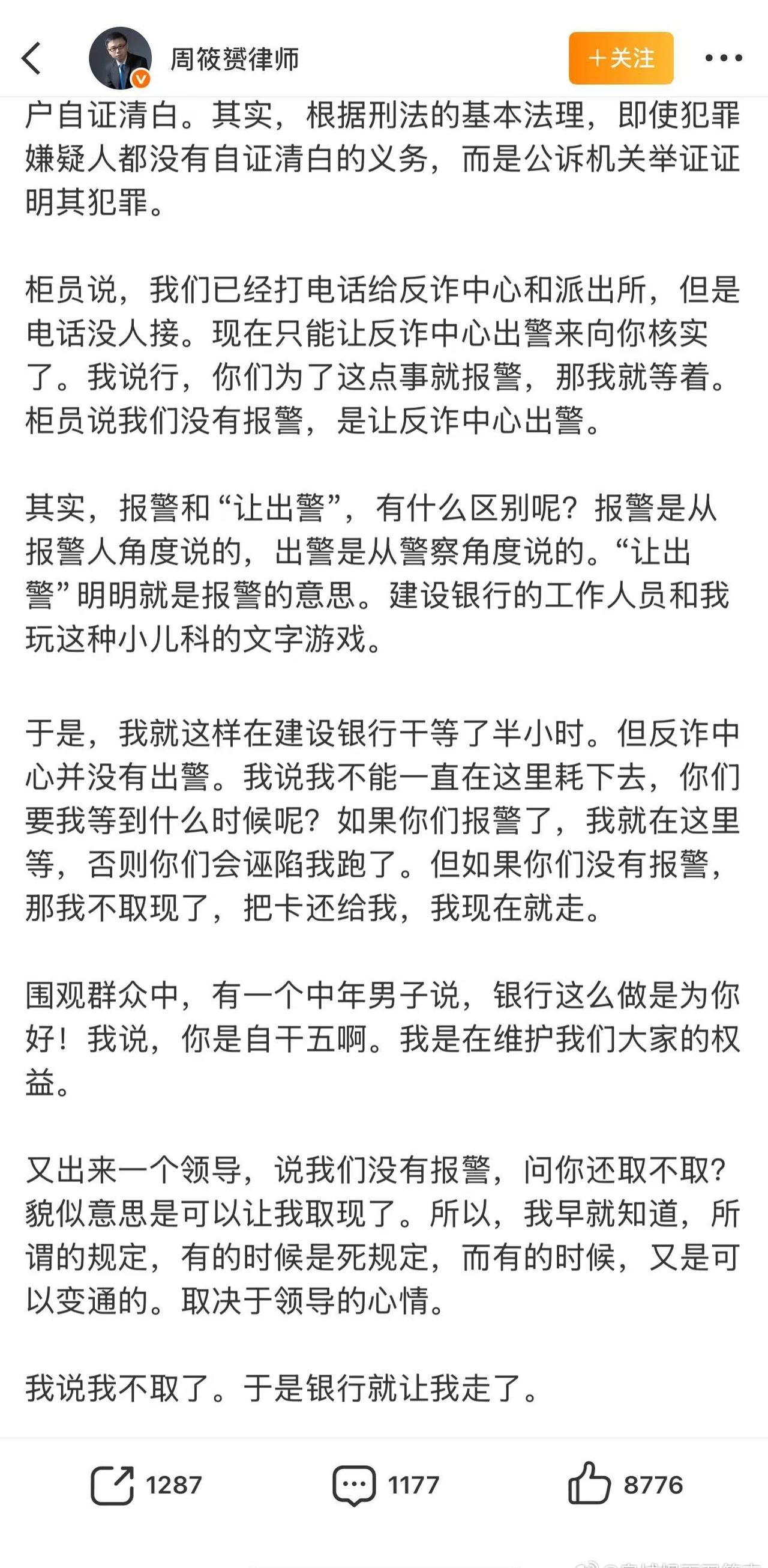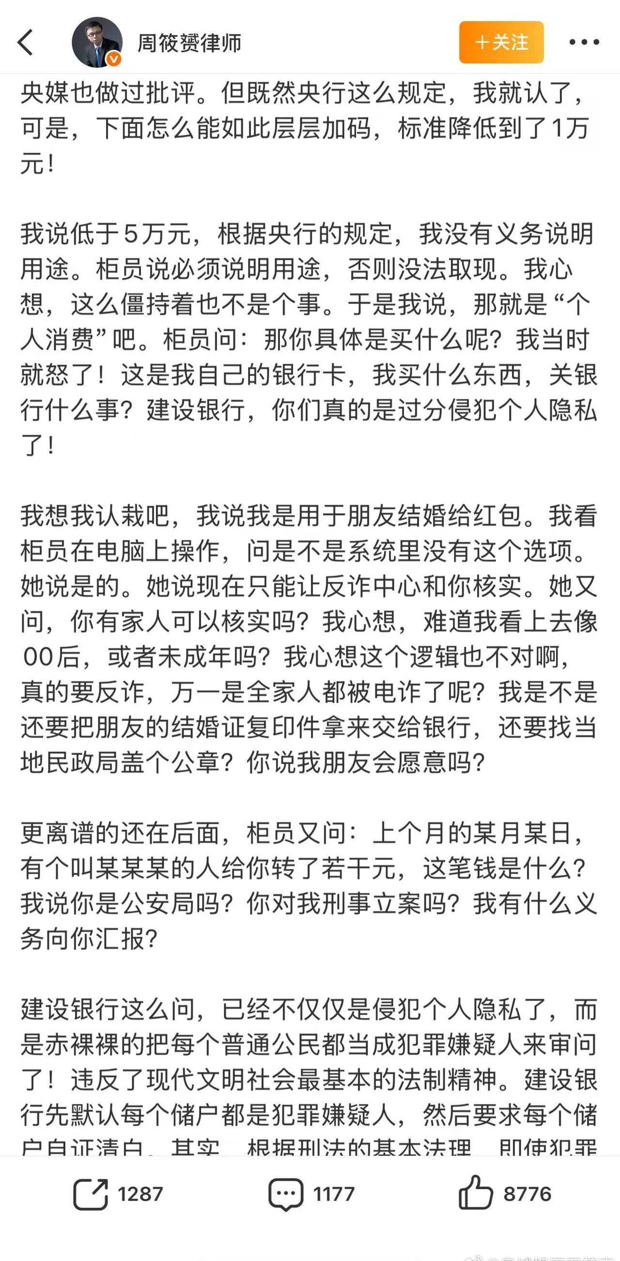 另外说几句。 这事的核心,不在于是否层层加码的问题,而在于是否涉嫌违法的问题。 用“层层加码”这样一个词,去进行报道,在某种程度上掩盖了涉嫌违法的本质。 从理论上来讲,只要储户没有因涉案而导致银行账户被有权机关冻结的话,储户应该随时可以取钱,不需要理由。 因为这就是储户的钱哈。 所谓存储关系,虽然属于债权的一种,但从本质上来讲,这个钱不是银行的钱,而是储户的钱。储户只是把钱,暂时放到银行那儿,保管一下而已。银行自身没有权力,越过法律规定,对储户的取钱行为,设置障碍。 不然的话,会直接击穿银行的金融信用。 如果银行可以无视自身金融信用的话,警方可能都无需做反诈追缴工作哈。假设某笔被骗的钱,在很短时间内,被从境内转到了境外,境内银行只要不去跟境外银行结算,就好了。 因为物理意义上的钱,可能根本没有移动。 对于境外的诈骗犯罪分子来讲,境外银行只要不让他们取钱,便好了,或者如果让他们取了,损失自担,反正境内银行不给境外银行结算,便好了。 但如果这么做的话,整个金融信用将被击穿,银行业将不复存在。 另外,假设如该律师所述,东营市当地反诈中心对取钱上限的审核,有自身的规定(降低到了1万元),这样的规定有没有涉嫌违法呢?东营市当地反诈中心,有没有权力越过央行的规定,自行作出更加严苛的规定呢? 从法律角度来讲,显然没有哈。 《立法法》对有权进行立法的主体,有明确规定,东营市当地反诈中心,级别太低太低太低,根本不在立法主体范围之内。 从本质上来说,这是一个违法行为。 违法设立跟上位法冲突的标准,违法指示当地银行按照自己的意见,设立审核标准。 这是层层加码的问题吗? 不是哈。 这是是否涉嫌违法的问题。 用“层层加码”这个词,去报道这样一个事件,貌似在批评,其实在偏袒,模糊了违法的本质,属于偷换概念式的报道。