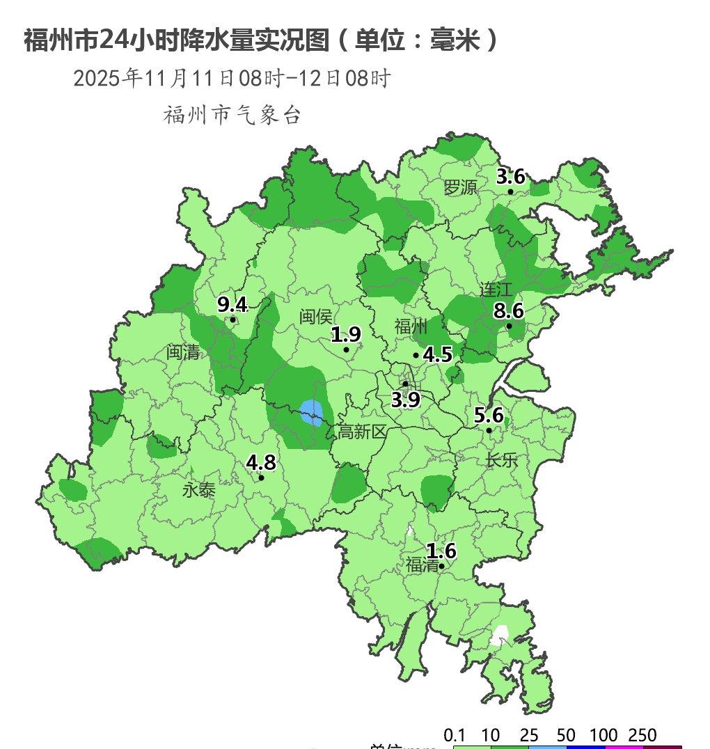 受台风“凤凰”和冷空气的共同影响,昨天白天到今天(12日,周三)早晨福州沿海地区和海拔较高的山区地带出现8~11级强阵风,以福州长乐区松下码头11级(风速:31.6米/秒)为最大。福州主城区(鼓楼乌山)最大阵风为6级(风速:11.8米/秒)。 全市范围内出现小到中雨,局地大雨。