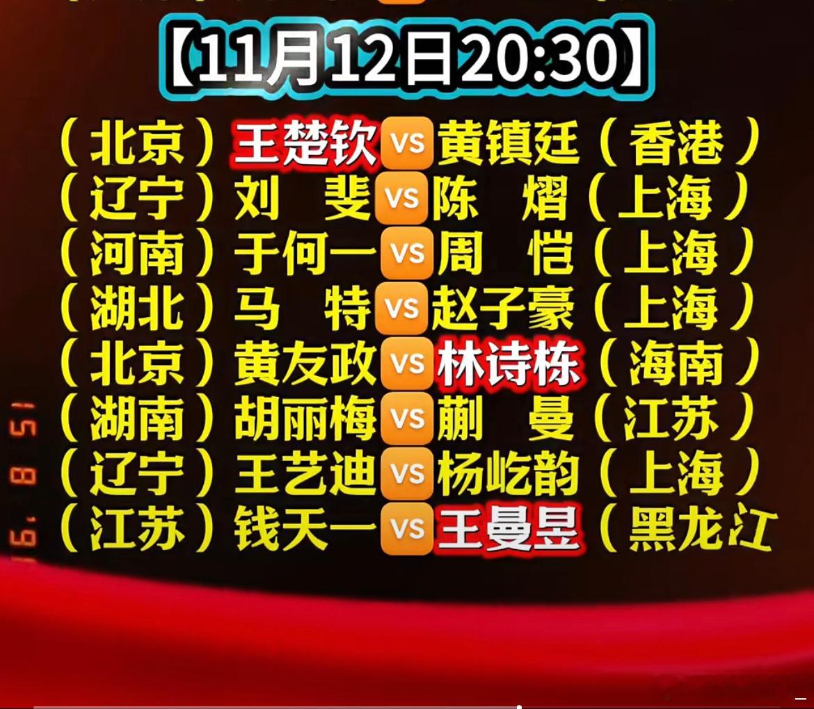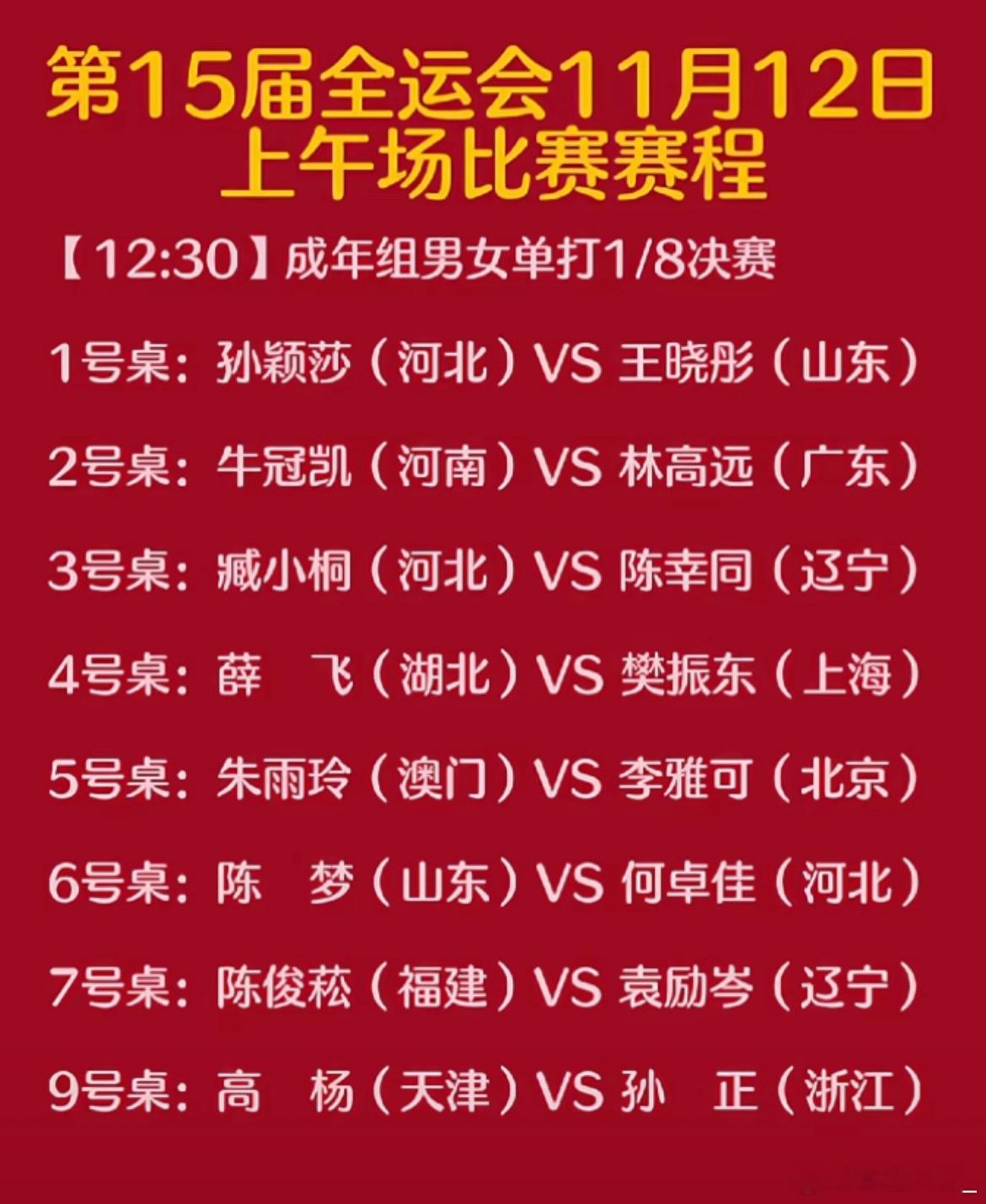 全运会11.12日乒乓球赛程!好期待俩小只的比赛!中午12:30 孙颖莎VS王晓彤,1号桌晚8:30王楚钦VS黄镇廷,1号桌