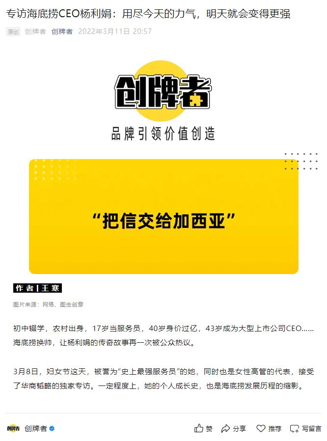 1994年,四川一女子为给哥哥还债,不惜陪伴老板24年,没想到老板后来大手一挥,女子身价直接暴涨到125亿,如今更是成为海外的大老板! 这个人就是杨利娟。 1994年,杨利娟的哥哥想做点生意给家里改善生活,东拼西凑借了钱还贷了款,没想到生意彻底赔了本,不光没赚到钱,还欠了一屁股外债。 那时候她才16岁,刚辍学就扎进简阳县城的小饭馆端盘子,一个月才挣一百多块钱。她自己只留下零头勉强够吃饭,剩下的全拿去填哥哥的债窟窿。没人能想到,这个整天在油烟里打转的小姑娘,将来能攥着上百亿的身家。 改变命运的机会,其实就藏在日常的小事里。常来饭馆吃饭的张勇总留意她——这人后来成了海底捞的大老板,可那时候也就守着家不起眼的小火锅店。 张勇发现,杨利娟擦桌子能把木头纹路里的油污都抠干净,给客人添茶从来不用等人家开口要,就算忙得脚不沾地,递个餐具都特别稳当。 张勇给她开160块的月薪邀她去自己店里,没想到这姑娘明明急着用钱,却一口拒绝:“现在的东家正缺人,我不能走。”就这份仗义,让张勇更认准了她,直到一年后饭馆倒闭,杨利娟才在他再一次邀请下,走进了海底捞。 1995年杨利娟成了海底捞的服务员,把帮哥哥还债的那股韧劲,全用在了工作上。 每天打烊后,她就借着路灯的光背菜单,客人提的意见记满了三个小本子。为了能看懂财务报表,她还报了夜校,硬是从连会计术语都不懂的小白,熬成了能核对百万元账目的老手。 1998年,才20岁的她就接管了简阳第一家海底捞老店,成了店里最年轻的店长。张勇对她的信任也不含糊,有次杨利娟妈妈病重,他直接塞给她800块“奖金”——这在90年代可不是小数目,足够付所有的医药费了。 1999年,真正的考验来了。张勇要开拓西安市场,把这个没人敢接的硬骨头扔给了21岁的杨利娟。 北方人不怎么爱吃辣,门店刚开半个月,每天来的客人连10个都不到,员工们都琢磨着收拾东西回老家。杨利娟没打退堂鼓,带着人挤公交去发传单,还照着西安人的口味加了酸梅汤和鸳鸯锅。 她能记住每个熟客的生日和不吃啥,甚至早到的客人,她还会煮免费的豆浆给人家喝。就这么熬了半年,门店前居然排起了长队,这场胜仗成了海底捞往全国扩张的起点,也让杨利娟彻底在公司站稳了脚。 之后的晋升,倒像顺理成章的事儿。2012年,所有门店的运营都归她管,每开一座新城市,选址谈判她都要亲自去;2014年她牵头搞了个“连住利益,锁住管理”的法子,把海底捞大规模开店时的管理麻烦给解决了。 后来有竞争对手想挖她,开出十倍的工资,都被她一句话怼回去:“张总把家里的底子都交给我管,这可不是钱能换来的。” 2018年海底捞在港交所挂牌,杨利娟就站在张勇身边敲钟,那时候她手里握着3.68%的股份,市值已经突破百亿了。 2021年《胡润中国职业经理人榜》一出来,杨利娟凭着125亿的身家排到第七,这数字就是对她守了24年的最好证明。 两年后,海底捞一年营收就有414.5亿,净利润涨了174.8%,光这一年她分到的钱就有1.49亿。但她没满足于当“分红女王”,2024年主动辞了海底捞CEO的职位,去当特海国际的掌舵人,专门做海外生意。 那时候她手里的特海股份虽说降到了3.08%,但就2024年一年,分到的钱还有1.38亿,海外的门店在她管着的半年里,就多了22家。 从简阳县城那个帮哥哥还债的姑娘,到能管着海外餐饮大摊子的CEO,杨利娟这125亿身家,从来不是老板“大手一挥”就给的。 是西安街头发过的传单、夜校里亮过的灯、拒绝挖墙脚时的那份硬气,还有跟海底捞绑在一块儿的24年,一砖一瓦堆出来的这份财富。 现在她在新加坡、美国的门店里,还留着当年记客人口味的习惯,只不过当年那个帮哥哥还债的小姑娘,早已经能自己掌舵自己的人生了。
