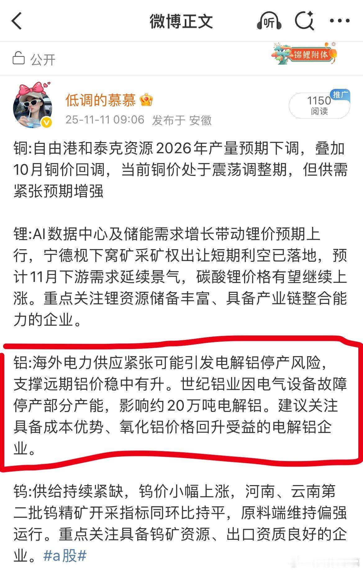 $中国铝业 sh601600$ 买进原因昨天在盘前提示了,海外电力供应紧张可能引发电解铝停产风险,支撑远期铝价稳中有升。