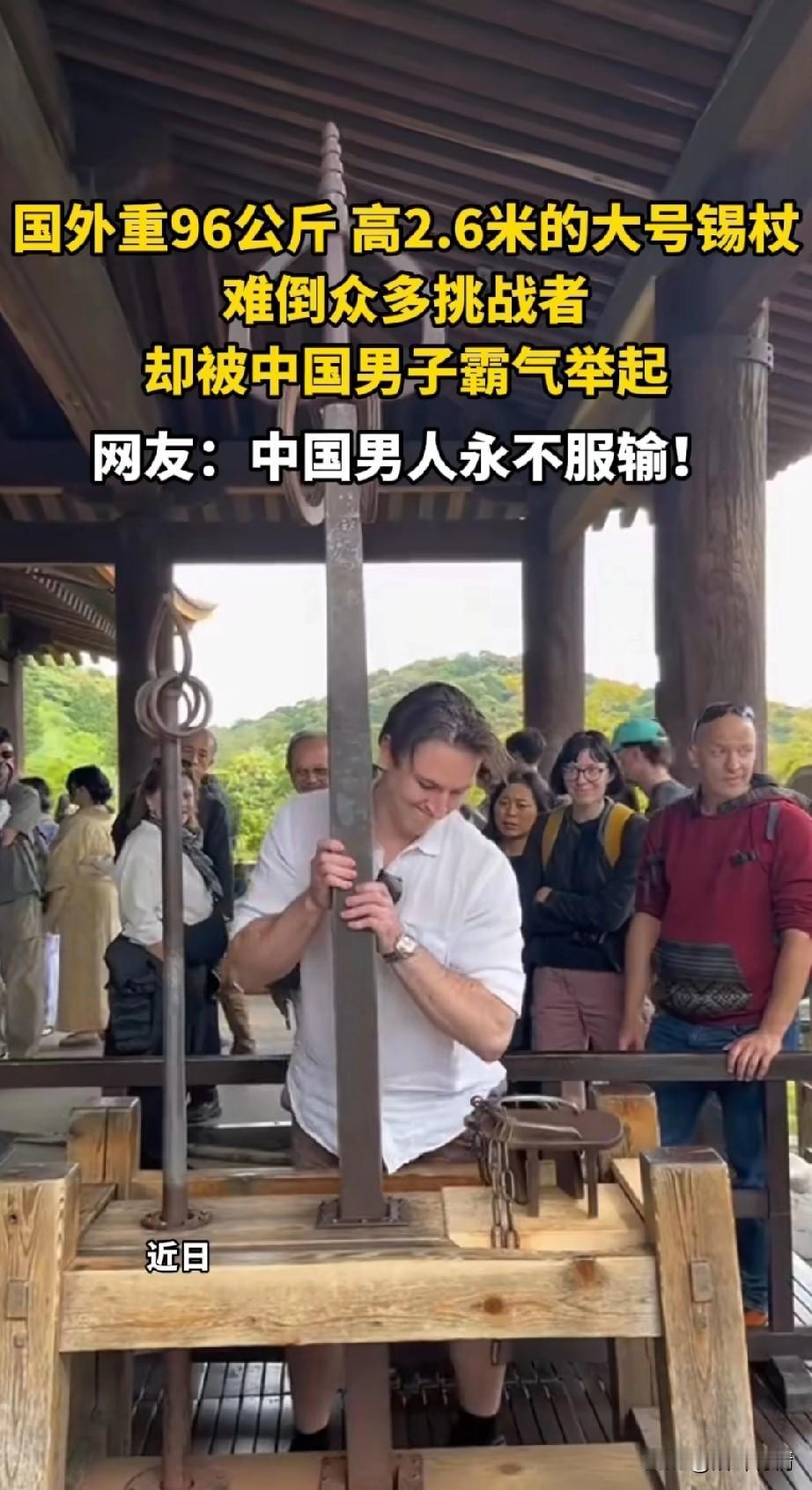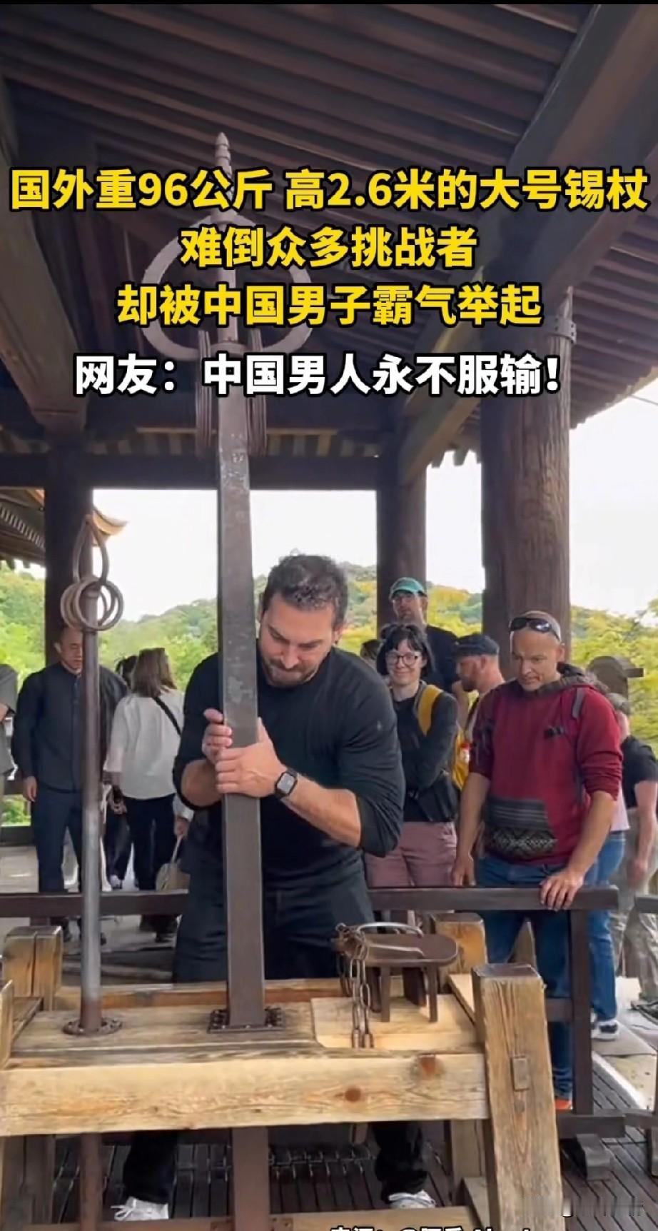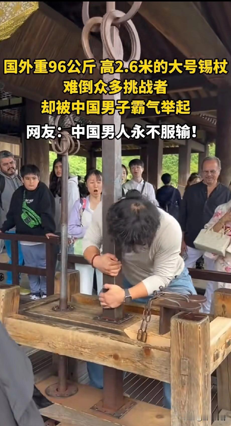 国外某处景点的大号锡杖, 重96公斤高2.6米, 绝对算是普通人的极限了, 很多老外都来尝试, 三四个老外都试过不行, 可以看出他们都使用了吃奶的劲, 都没有举起杖子, 结果一名中国小伙子不信邪, 于是也来尝试了一天, 看着小伙子身高不够, 体重也就那样, 只见他瘦瘦交叉, 随后直接提了起来。 这可把附近的老外惊呆了, 还有小朋友发出了哇塞的声音, 网友表示中国男人永不服输! 大家对于小伙景区举起超重权杖怎么看? 每人推荐一个旅行目的地 锡文化雕像 九龙锡杖 锡杖项链
