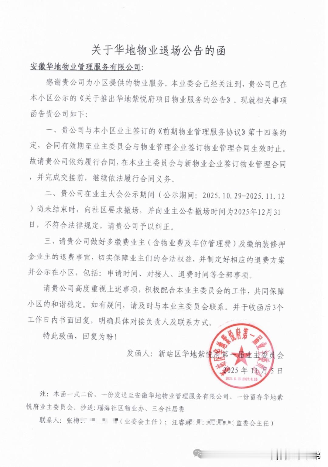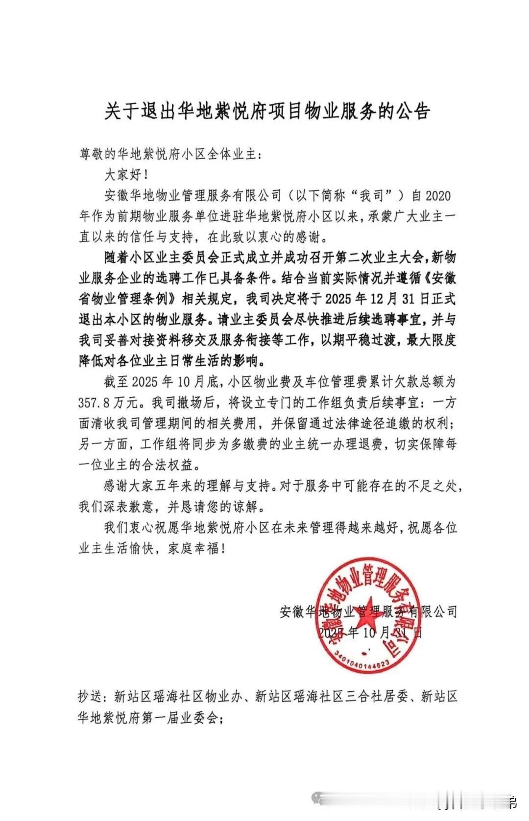 合肥新站区突发!华地紫悦府物业要撤场?业主炸了 欠费357万!华地紫悦府物业突然发公告,宣称即将撤场离场!但业主们坚决不接受——业委会直接回应:12月31日贸然撤场不符合规定!明确要求物业必须先和新物业完成交接,同时妥善处理物业费、车位费等退费问题,才能正式离场! 一边是欠费撤场,一边是业主担忧生活保障+退费权益,这事你怎么看?欢迎评论区聊[what]~