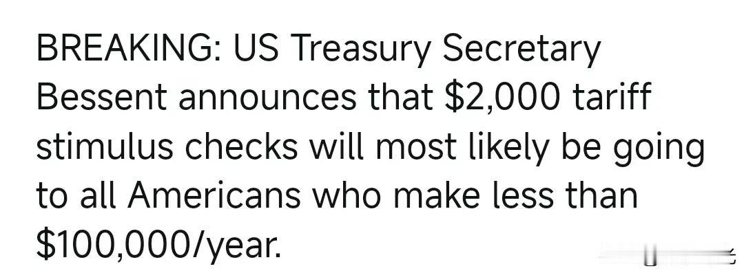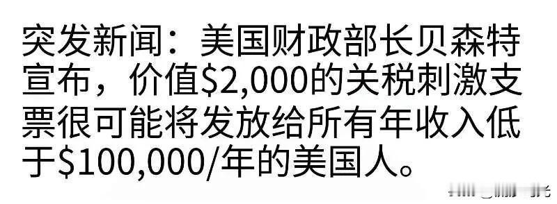 美国财政部长贝森特宣布,2000美元的关税刺激支票很可能会发放给所有年收入低于10万美元的美国人。