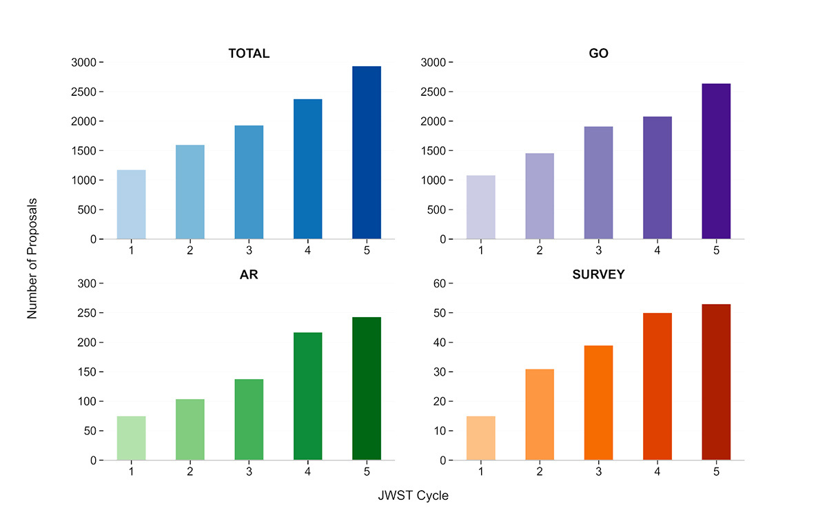 【韦伯第五周期观测提案数量再创新高,观测服务严重供不应求】詹姆斯·韦伯太空望远镜(JWST)的观测需求持续增长,提案提交数量和平均观测时间请求均呈上升趋势。JWST旨在加速科学发现进程,第五周期征集共收到2935份提案,创下新纪录,表明天文学和行星科学界正积极推动一系列旨在改变宇宙认知的研究项目。具体提案分布包括:2,639份一般观察者(General Observer)提案,申请观测时间101,751小时(对比可用8,000小时,超订率达13:1);53份巡天(Survey)提案;14份纯并行(Pure Parallels)提案;243份档案研究(Archival Research)提案;116份机会目标(Target of Opportunity)提案;以及105项联合计划(与哈勃太空望远镜、ALMA、钱德拉望远镜、凯克望远镜、XMM、NOIRLab、NRAO和TESS合作)。第五周期还包含两项特别倡议:长期监测(52份提案)和罗曼望远镜预备科学计划(35份提案)。提案的科学类别分布与以往周期相似。JWST用户群体持续扩大。第五周期提案涉及7509名独立研究者,覆盖59个国家和美国47个州,研究者来自不同职业阶段和机构背景。这一活跃社区支撑了提案的同行评审流程,确保评估过程公正严谨,从而筛选出最具科学价值的研究以最大化JWST宝贵观测时间的回报。约540名专家受邀参与第五周期望远镜分配委员会(TAC)。面对日益增长的观测时间需求,空间望远镜科学研究所(STScI)将持续招募更多社区成员担任未来周期的评审员。