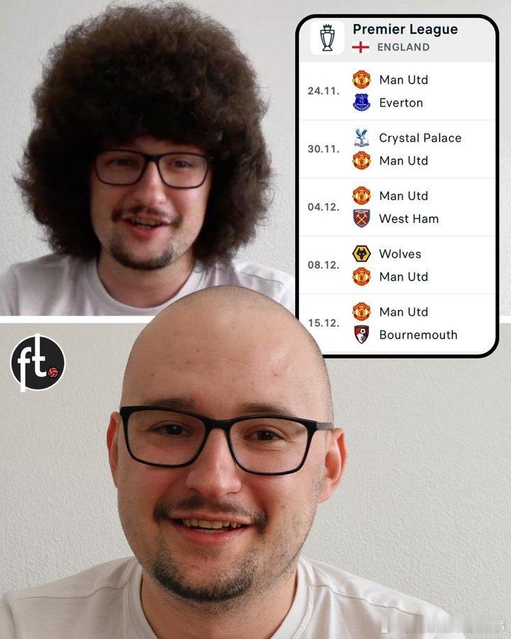 曼联接下来的五场比赛,这可能是蓄发哥最接近理发的时刻......👀▪️ vs埃弗顿(主场)▪️ vs水晶宫(客场)▪️ vs西汉姆联(主场)▪️ vs狼队(客场)▪️ vs伯恩茅斯(主场)