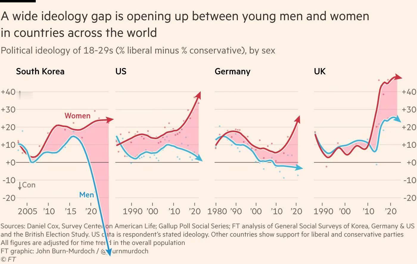 新时代来临,全球女性越来越自由,男性越来越保守,年轻男女之间的政治意识形态鸿沟急速扩大。在南韩、德国、英国与美国等国家,18~29岁的女性越来越倾向自由派,而男性则往保守方向移动,形成前所未见的对立结构。最极端的例子出现在南韩,年轻女性的自由派比例,高达+25%,而男性则骤降至接近-50%,意识形态分化,预示未来世代政治的极化风险,男女不再仅在经济地位上分歧,更在世界观与价值观上逐渐走向对立。~~~~~~~~~~~~也不知道中国怎么样?