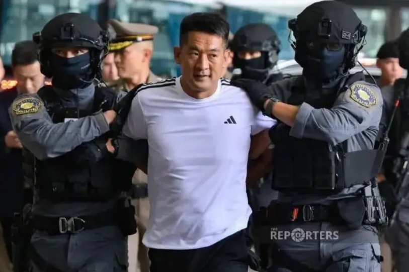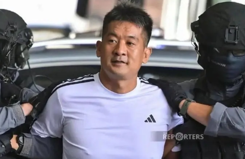 脚穿塑料拖鞋,身穿黑色马裤,白色T恤,身材魁梧,精神饱满,看上去一表人才(也的确是个人才,只是没有用在正途上)。殊不知,天网恢恢,疏而不漏,今天上午,佘智江被泰国警方押送到曼谷素万那普机场,然后引渡回国。