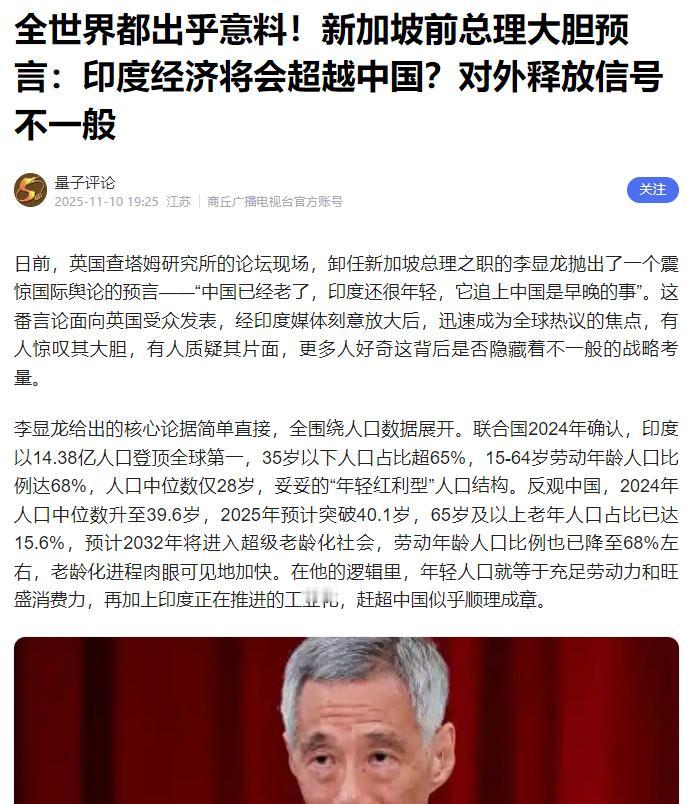 李显龙在新加坡当了20年总理,如今以国务资政身份去伦敦开会,直接放话:中国老了,印度经济未来可能超车。   李显龙的这种说法,与其说是按经济规律得出的判断,不如说是新加坡在外交和经济上的小算盘摆得明明白白。这话里的门道,藏着新加坡和印度这些年越走越近的原因,更藏着对中印经济真实情况的故意曲解。   作为东南亚的金融中心,新加坡搞外交从来都是奔着利益去的,而印度这个有14亿人的大市场,刚好成了它眼里最有盼头的“潜力股”,两国的联系早已经渗透到贸易和投资的方方面面。   新加坡有多看重印度,实打实的数字一摆就清清楚楚。过去25年里,新加坡给印度投的钱加起来有1748亿美元,占了印度外来直接投资总额的近24%,稳稳当当地成了印度最大的外资来源国。   2024到2025财年,新加坡在印度与东盟十国的贸易总额里,直接占了27.83%,比其他几个东盟国家加起来都多。   第三届印新部长级圆桌会议上,两边的部长凑在一起聊数字经济、互联互通这些合作方向,新加坡的淡马锡集团还砸钱入股了印度的支付软件Paytm,这软件一度被吹成“印度版支付宝”;就连印度的电商平台Flipkart,背后也有新加坡资本在撑腰。   新加坡的精明就在于,只做稳赚不赔的财务投资,绝不去碰印度制造业那些难啃的硬骨头,这种合作更像是“搭顺风车”,压根算不上真正的“绑在一起发展”。   李显龙说中国“老了”,估计光盯着咱们的人口老龄化数据——2024年中国60岁以上的人占比都超21%了。可他偏偏忘了,咱们14亿人口的大盘子在这,光劳动年龄人口就有8.8亿,这数字比印度全国人口还多将近3亿。   更别说中国每年有近千万高校毕业生,其中学理工科的占了四成以上,这些年轻人正一股脑往新能源、高端制造这些领域扎。   中国的“老”,从来不是走下坡路,而是发展到一定阶段后,往更高质量的方向走。   2024年咱们的研发投入占GDP比重达到2.5%,研发人员数量连续12年都是世界第一;华为一年申请的专利就超过7000件,比亚迪的第1000万辆新能源汽车,咔嚓一下就下线了,从500万辆到1000万辆,只用了15个月。这创新速度,怎么看都跟“老了”不沾边。   被李显龙夸成“潜力股”的印度,2024年GDP增速确实冲到了7.5%,看着挺亮眼。可要是把这增速的外皮扒开,里面全是坑。   印度的人均GDP还不到中国的五分之一,卢比兑人民币的汇率常年都在0.08左右晃,100卢比换过来还不到8块钱。   他们常说的“人口红利”,往深了看更像“人口负担”——近一半的劳动力连初中都没毕业,能做高端制造的技术工人还不到5%。   苹果把一部分手机组装线搬到印后,动不动就传出良品率不足70%的消息,重要的芯片、屏幕照样得从咱们这买。   中国经济的抗造能力,全靠咱们那一条从头到尾都齐整的产业链。2024年比亚迪卖了427.21万辆车,不光稳稳拿下世界销量第一,还把老美的通用、福特远远甩在了身后。从芯片设计到电池生产,再到整车组装,每一步都能自己搞定。   印度虽说号称“世界药房”,可他们的仿制药原料,十成里有七成得从中国买;手机组装看着热闹,核心零部件的进口依赖度却超过90%。   更要命的是物流成本,比中国高30%,光港口清关就得等一个星期,而中国宁波港早就实现“秒级通关”了。这种效率上的差距,让印度根本接不住高端制造的转移。   李显龙没说的是,2024年中国社会消费品零售总额突破47万亿元,内需市场的规模是印度的6倍,这种实打实的市场潜力,才是经济稳增长的定海神针。   印度经济的增长,更像是因为底子薄才显得快的“虚火”。2025年特朗普搞关税战时,印度的外国直接投资净额曾单月暴跌99%;缺电更是家常便饭,北方邦就出过72小时大面积停电的情况,工厂没法子,只能自己备着发电机才敢开工。   而中国不光扛住了外部压力,还在新能源、人工智能这些领域开辟了新赛道。2024年中国新能源汽车出口41.72万辆,同比增长71.86%,在全球市场的份额一个劲地涨。   新加坡选择押注印度,说白了是出于地缘政治的考虑,想在中美之间找平衡。可经济规律从不看政治表态,中国的“老”是转型升级的从容,印度的“快”是基础太差的追赶。   李显龙那番话,更像是一场精准的外交喊话,算不上客观的经济分析。毕竟真要比硬实力,2024年中国GDP总量是印度的5.2倍,这么大的差距,哪是一句“未来可能超过”就能追得上的?