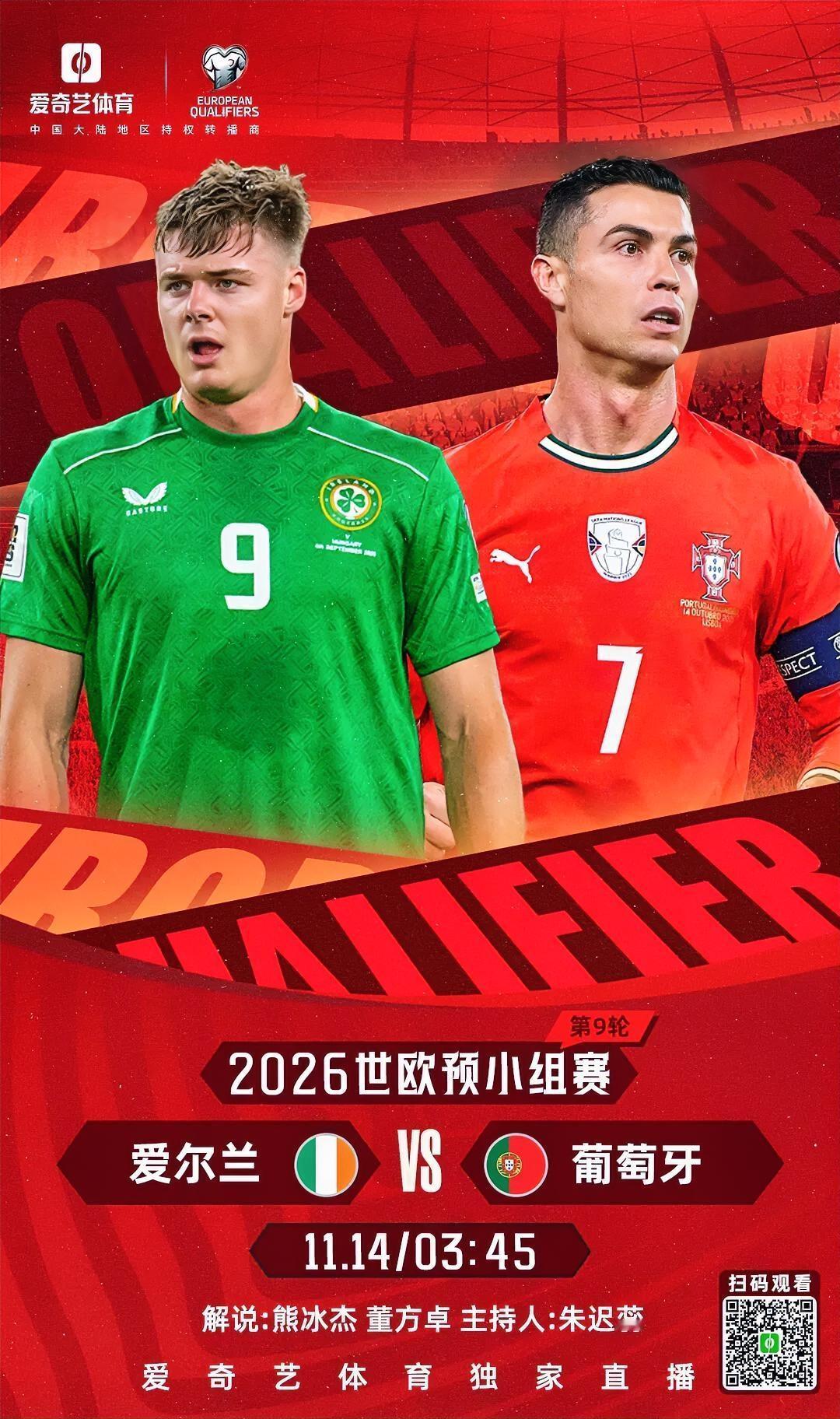 2026年美加墨世界杯欧洲区世预赛小组赛第9轮赛事预告:爱尔兰vs葡萄牙 冬日生活打卡季 2026年美加墨世界杯欧洲区世预赛小组赛第9轮将在明天凌晨3点45分继续进行,争夺剩余直接美加墨世界杯欧洲区15个国家队名额,在上个月英格兰国家队率先晋级直通美加墨世界杯。在欧洲区世预赛F小组中,如果葡萄牙顺利赢下爱尔兰,他们将直通美加墨世界杯。 在2026年美加墨世界杯欧洲区世预赛小组赛阶段第9轮,爱尔兰将在主场都柏林迎战同组即将直通美加墨世界杯C罗领衔 葡萄牙队,本场比赛收看平台:爱奇艺体育,解说嘉宾:熊冰杰、董方卓,主场人:朱迟蕊。 葡萄牙目前在欧洲区预选赛F小组中以积10分排名小组第一名,领先第二名匈牙利5分,在11月14和11月16葡萄牙将先后迎战爱尔兰和亚美尼亚,只要再赢一场比赛就可以提前晋级世界杯! 葡萄牙最新一期国家队名单是由40岁C罗、B费和B席领衔,菲利克斯在列。在昨天葡萄牙队官方公布:佩德罗-内托和贡萨尔维斯因伤退出本期大名单,在新一期葡萄牙国家队名单中,努诺·门德斯也因伤缺席本期集训。 葡萄牙11月最新一期大名单如下: 门将:迪奥戈-科斯塔(波尔图)、若泽-萨(狼队)、鲁伊-席尔瓦(葡萄牙体育) 后卫:达洛特(曼联)、塞梅多(费内巴切)、坎塞洛(利雅得新月)、努内斯(曼城)、鲁本-迪亚斯(曼城)、伊纳西奥(葡萄牙体育)、安东尼奥-席尔瓦(本菲卡)、雷纳托-韦加(比利亚雷亚尔) 中场:帕利尼亚(热刺)、鲁本-内维斯(利雅得新月)、若昂-内维斯(巴黎圣日耳曼)、维蒂尼亚(巴黎圣日耳曼)、B费(曼联)、B席(曼城) 前锋:卡洛斯-福布斯(布鲁日)、菲利克斯(利雅得胜利)、特林康(葡萄牙体育)、弗朗西斯科-孔塞桑(尤文图斯)、莱奥(AC米兰)、贡萨洛-拉莫斯(巴黎圣日耳曼)、C罗(利雅得胜利)。