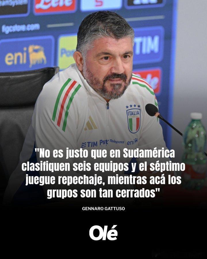 【质疑赛制不公】意大利主帅加图索对比世界杯欧洲区预选赛与南美区预选赛:“我们必须好好审视出线规则。看看南美的赛制,10支球队中6支直接晋级,第七名还可以与大洋洲球队进行附加赛,这就是令人失望的地方。我们确实需要重新考虑一些事情。至于其他,我的注意力完全在明天的比赛上,我不会多想。”世预赛欧洲区意大利目前在I组排名第二,落后领头羊挪威三分,净胜球相差16个。如果最终排名第二,则需要通过附加赛争夺世界杯资格。