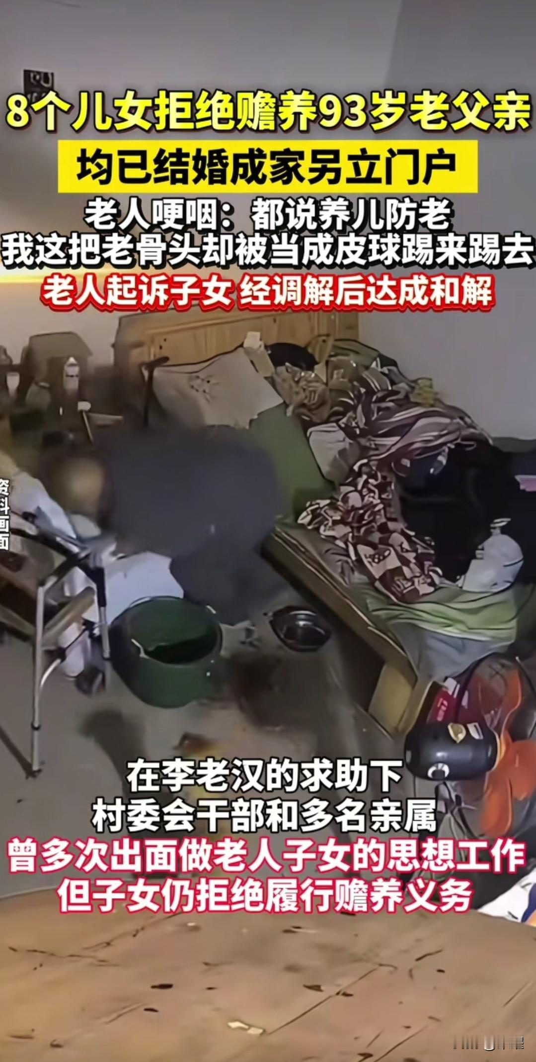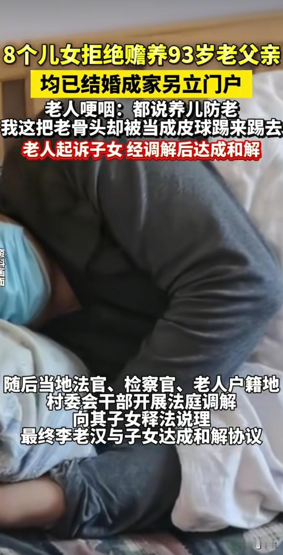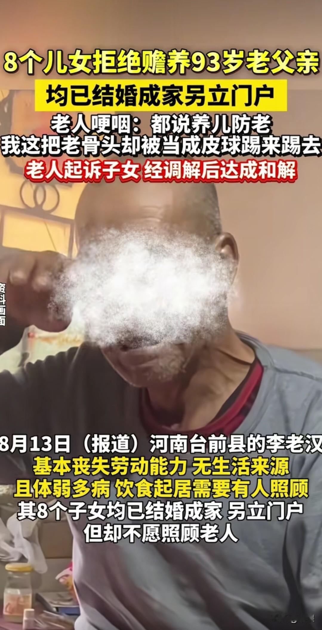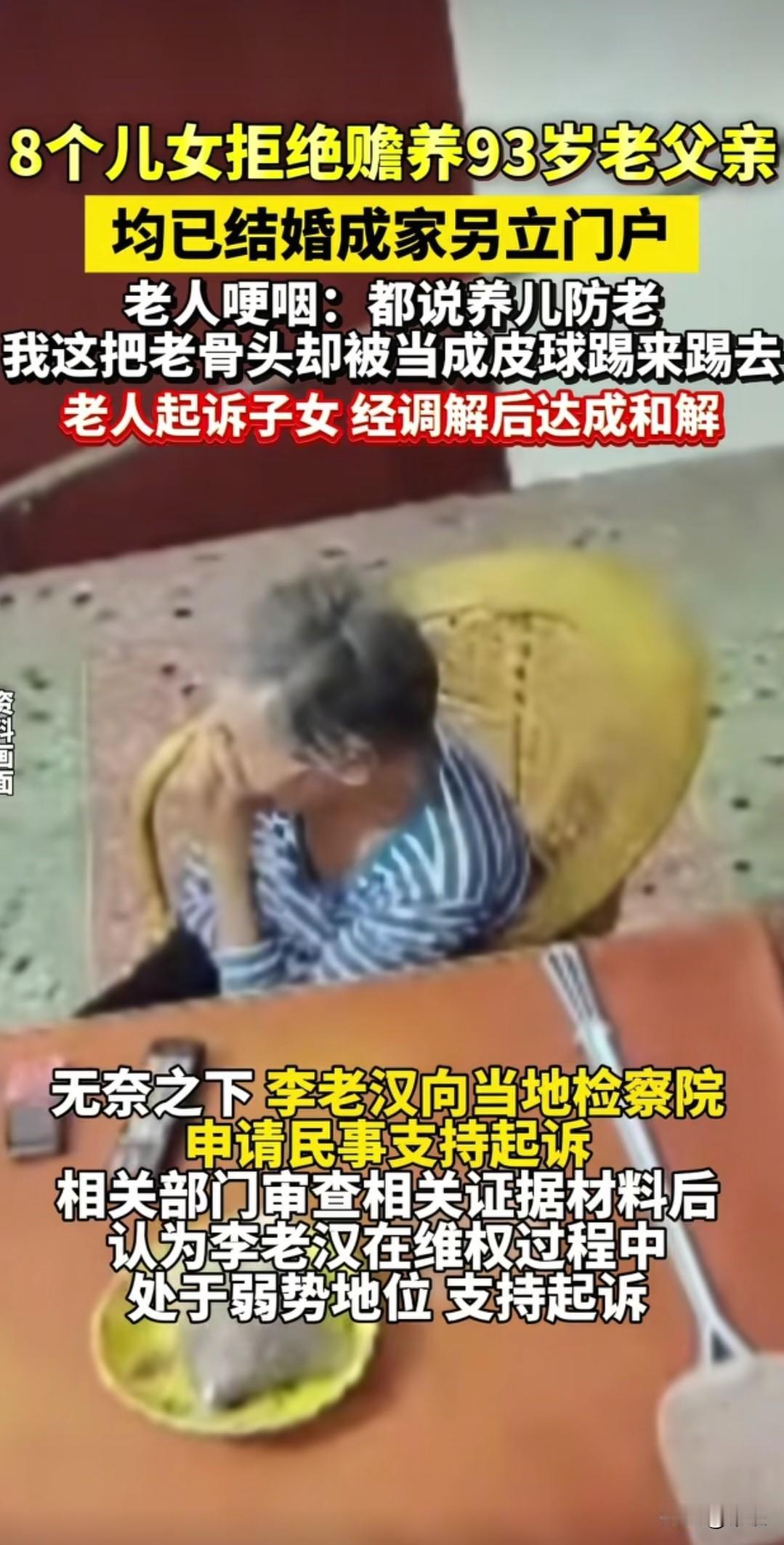 耗尽半生 养大子女 93岁了,8个子女都拒绝赡养老父亲 靠起诉、调解才勉强履行,太让人心酸。 各自成家后,亲情就被日子拆得七零八落。 都说百善孝为先, 可日子过着过着,有些人就忘了。 爸妈不是一下子就变老的,他们失去劳动能力,没有经济来源,需要人照顾的才是最需要孩子们的时候。 更可叹的是,老人最后所谓的和解,也就是无奈的妥协。 他要的不是赢官司, 只是想有个安稳的晚年。 养儿防老,友友们怎么看? 父母赡养 养子女赡养义务 晚年赡养 赡养 赡养老 老人赡养 家庭赡养费用