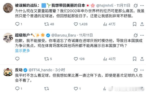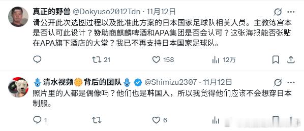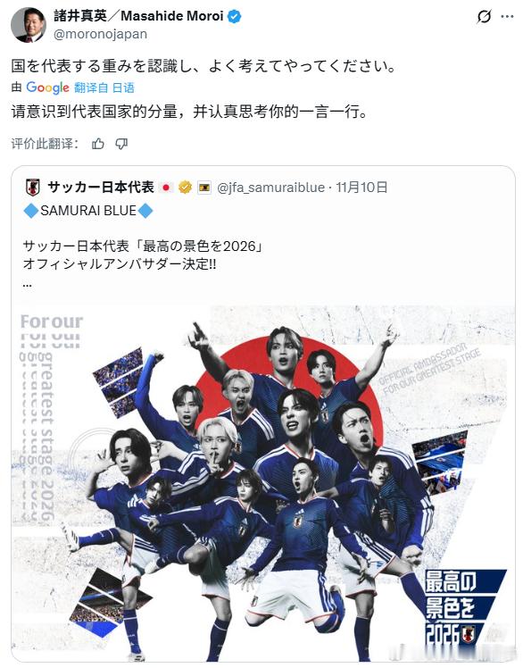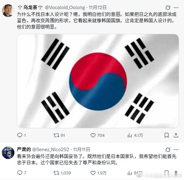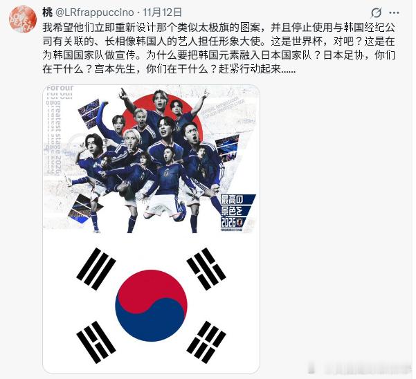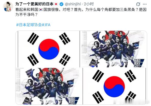 今天刚吃的瓜,日本球迷因为国家队宣传海报闹起来了原因是日本足协请了偶像艺人作为国家队宣传大使,但海报中的日本国旗被装饰得很像韩国太极旗……海报中心原本是日本国旗,但加上三道杠元素,而且摆放位置很微妙,就……有点韩。日本球迷就不愿意了,评论区基本都是喷的,县议员也表态应该慎重,截几个大家看看三天过去了,日本足协并没有回应球迷的呼吁重做海报