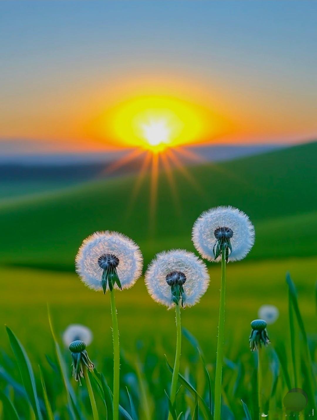 “落日把温柔揉进风里,蒲公英举着蓬松的星子,等一阵风来,就把整个春天的浪漫,散作漫山遍野的轻盈。生活偶尔像攥紧的拳头,但此刻,连呼吸都裹着青草香——原来松弛下来,连等待都是毛茸茸的甜。”