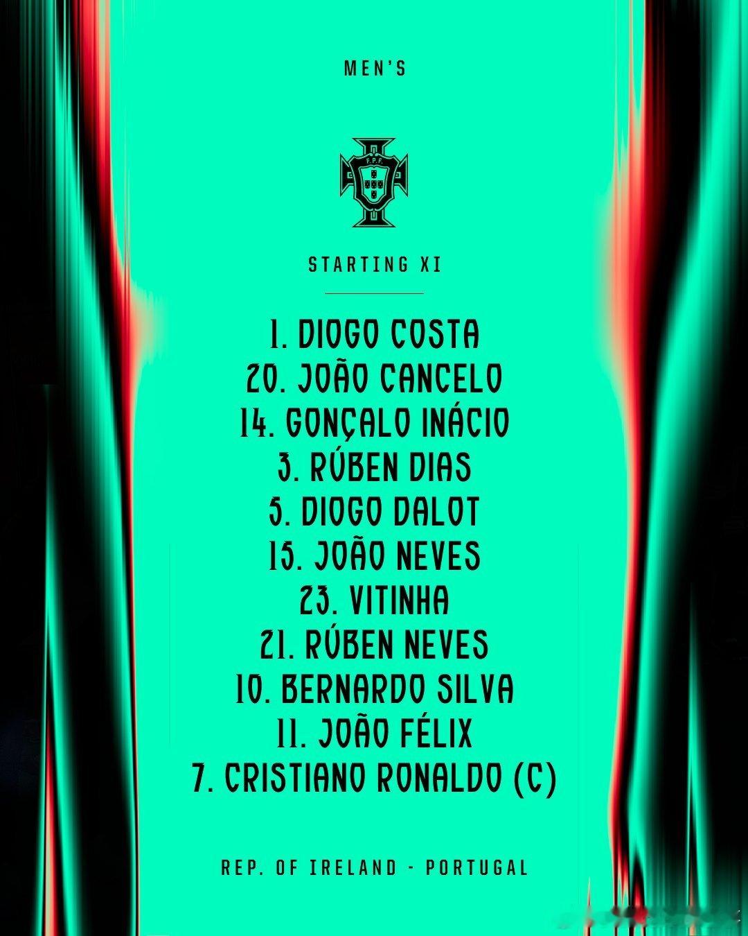 首发阵容⬇️爱尔兰首发:1-凯莱赫、5-奥布莱恩、4-奥谢、22-柯林斯、2-科尔曼、3-斯凯尔斯、11-阿扎兹、8-泰勒、6-库伦、20-奥贝恩、7-帕洛特葡萄牙首发:1-迪奥戈·科斯塔、14-伊纳西奥、3-鲁本·迪亚斯、5-达洛特、20-坎塞洛、15-若昂·内维斯、21-鲁本·内维斯、23-维蒂尼亚、10-B席、11-菲利克斯、7-C罗