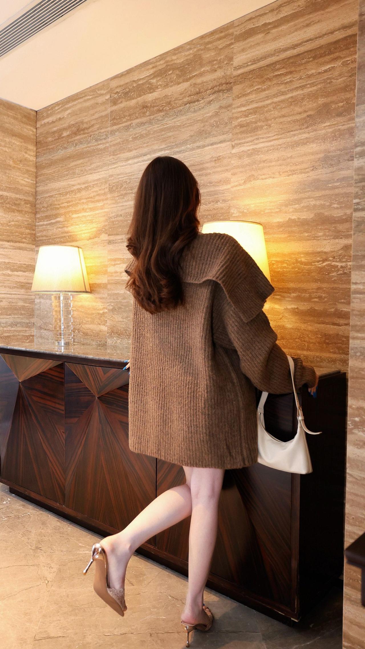 米色连衣裙外搭对开毛衣,轻松营造慵懒随性的时尚感