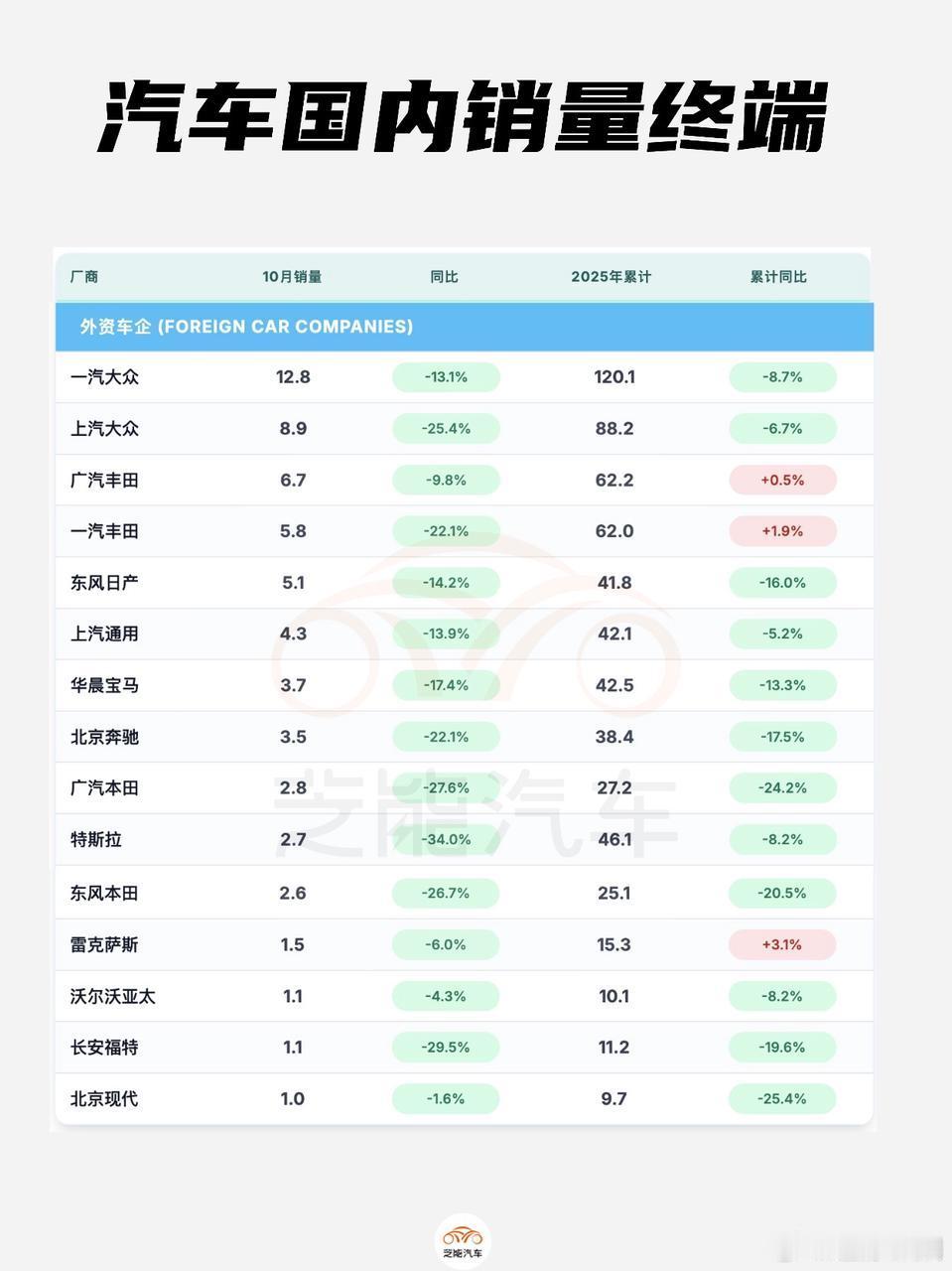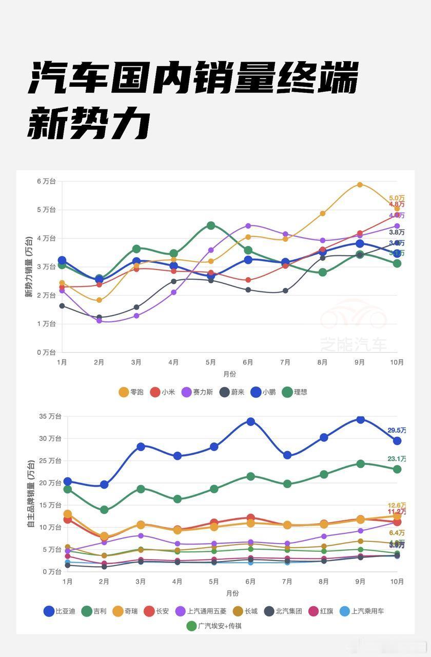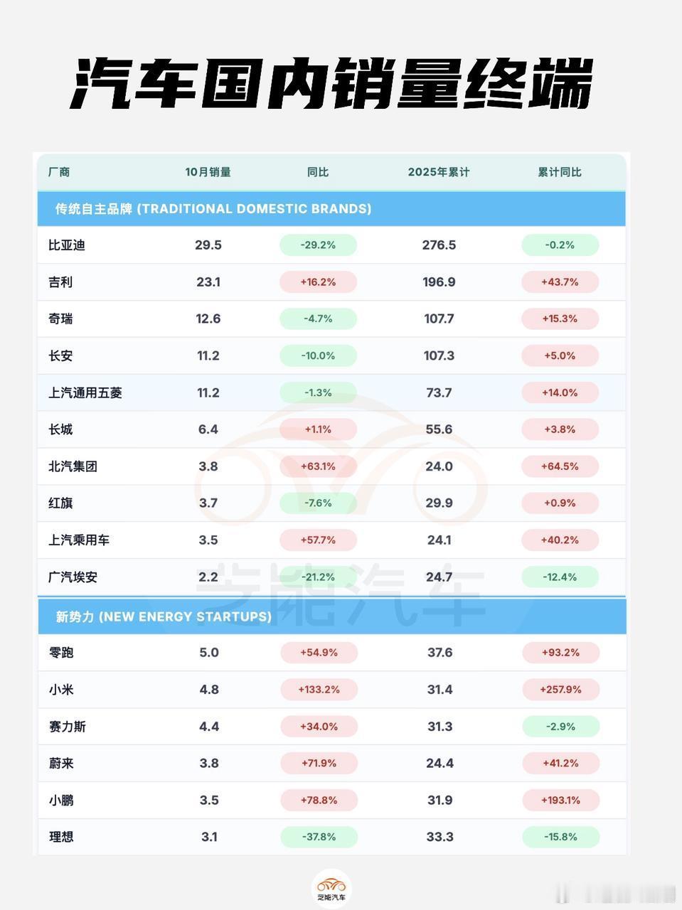 2025 年 10 月中国汽车终端销量略有回落,受补贴退坡和去年高基数影响,后续两月预期平稳。自主品牌表现分化,吉利、奇瑞等保持增长,北汽、上汽乘用车增速亮眼;新势力集体发力,零跑、小米、小鹏等均实现大幅增长。外资车企普遍遇冷,多款主流品牌销量两位数下滑。新能源汽车仍是市场增长核心,后续细分市场变化值得关注~