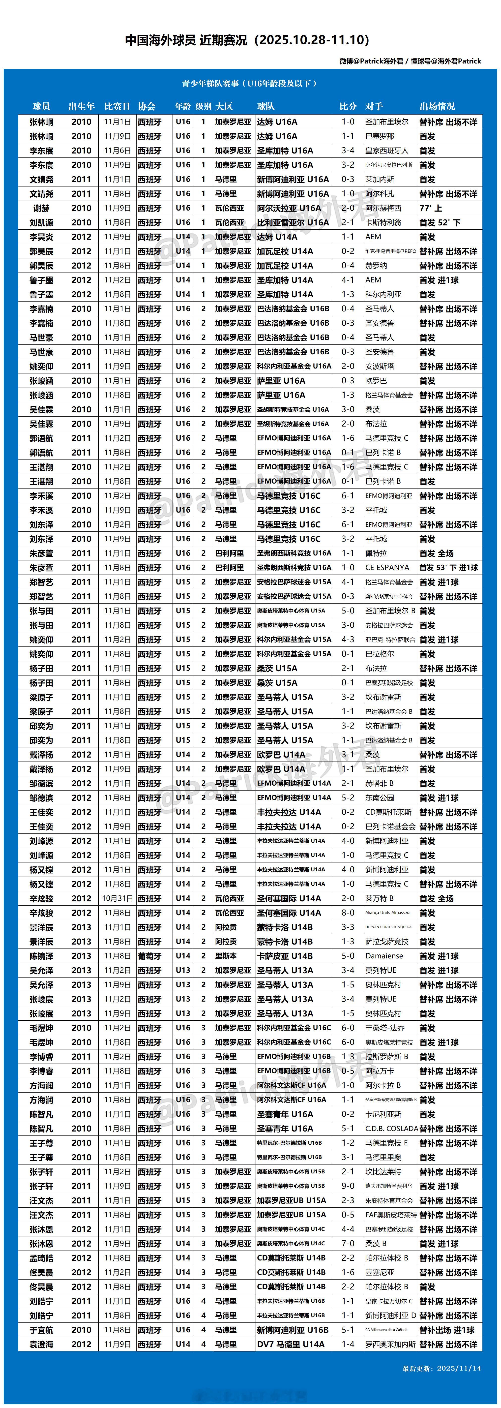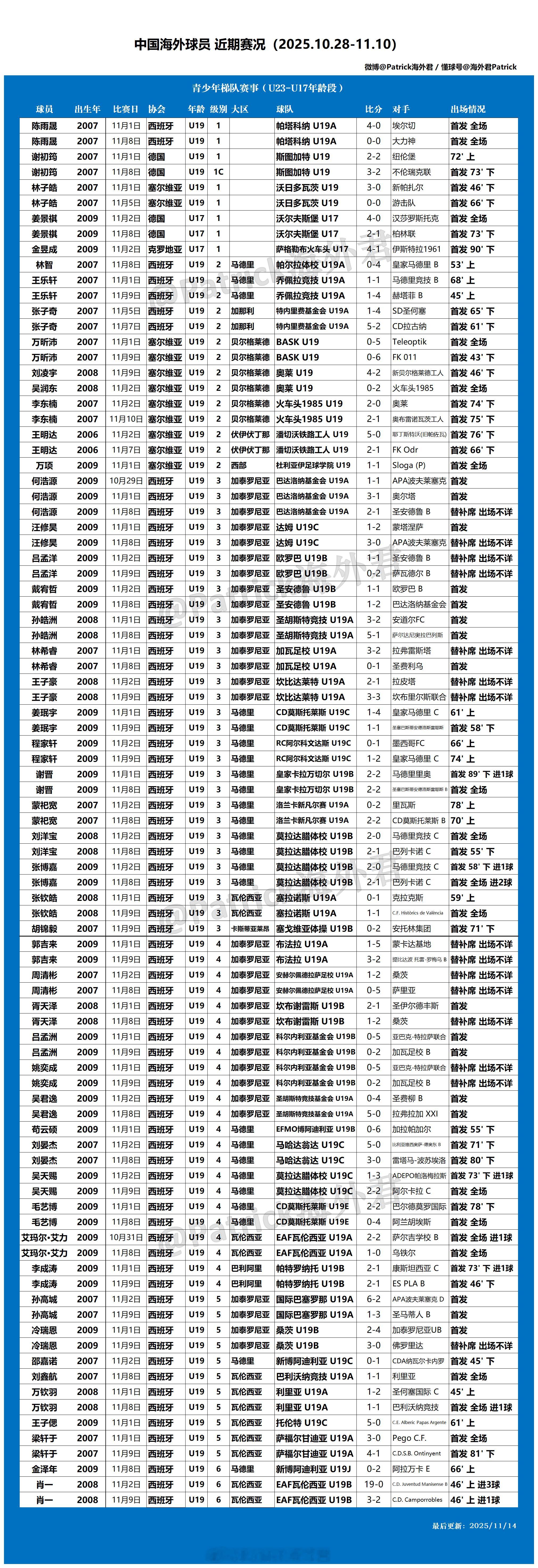 海外球员比赛一览 (2025年10月28日-11月10日)