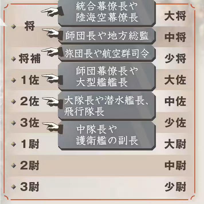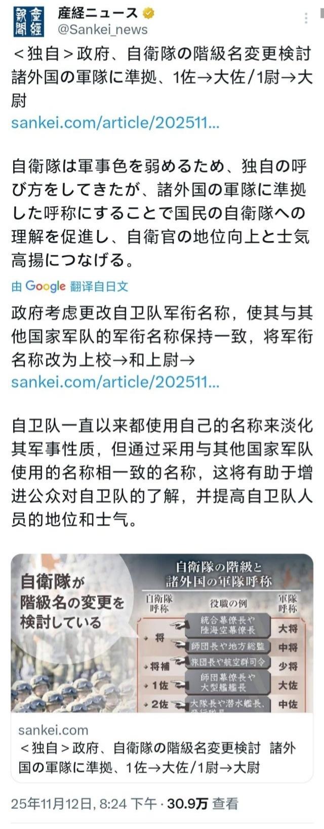 高市早苗,准备要让日本军国主义死灰复燃! 据《产经新闻》报道称,日本首相高市早苗正考虑为日本自卫队的“军衔”改名,将“1佐”改为旧称“大佐”。 之前,之所以要采用数字军衔,是想淡化军队色彩,强调自卫属性; 但现在,改为旧称,无疑是军国主义死灰复燃的节奏。 不过,这样也挺好的,帮助年轻的战士和人民英雄纪念碑中的英烈前辈对齐颗粒度。 逢年过节提着俩1佐的领章去祭奠,前辈可能看不懂; 但提着大佐的去,那大家就全都看懂了 想想能干掉几个大佐,太带劲了。
