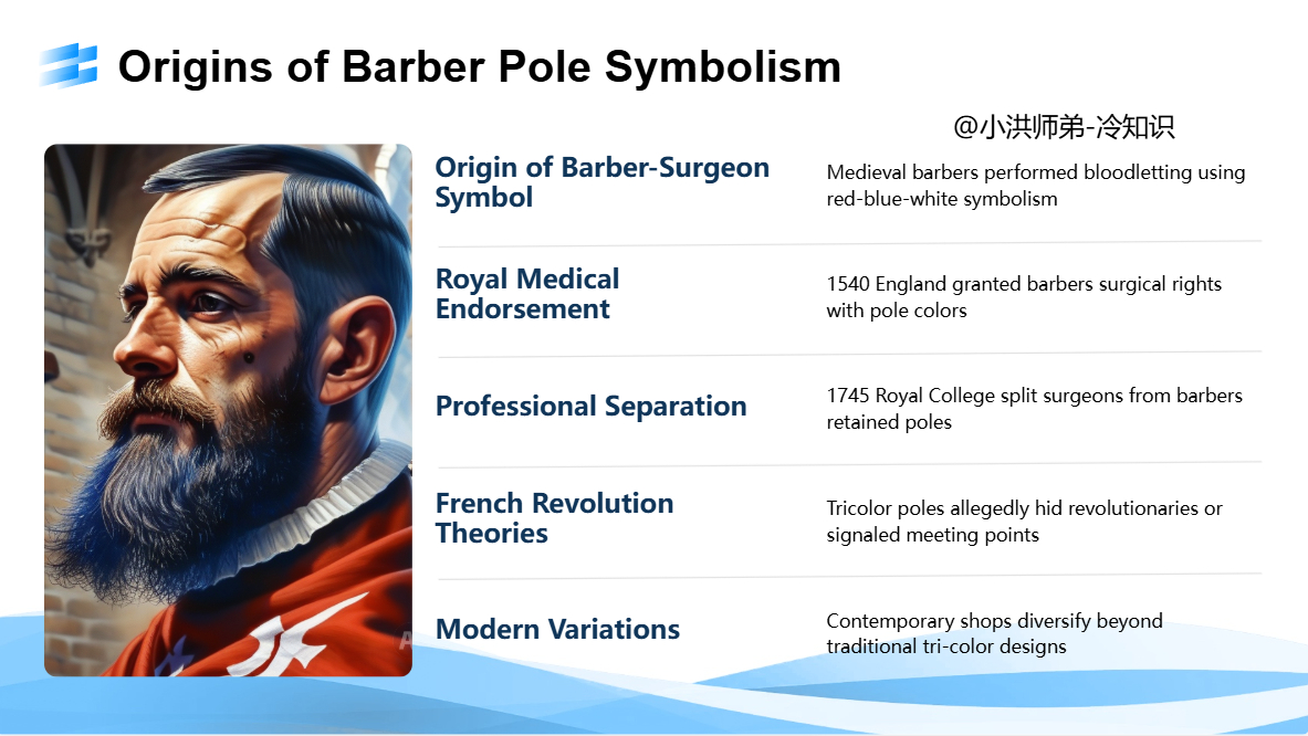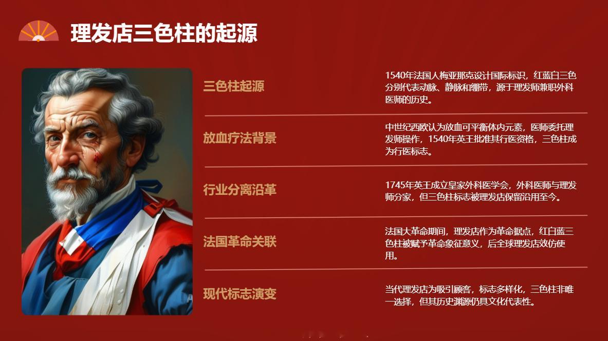 理发店为什么要以三色柱为标志?大多数理发店的门口都有一个旋转的红、白、蓝三色柱,这几乎成了理发店的一个标志了。这是为什么呢?据法国人梅亚那克1540年设计的国际通用标识,红色代表动脉、蓝色代表静脉,白色代表绷带,理发店为什么要用代表动脉、静脉和绷带的颜色做标志呢?在中世纪的西欧,流行的观点认为人之所以生病,主要是因为体内各元素不平衡,只要引出多余的元素,就会恢复健康。欧洲人普遍认为“放血是康复之始”,因为血液被他们认为是最容易引出的一种“元素”。但遇到有人需要放血时,医师却不肯动手,他们认为这是下等人做的事。怎么办呢?后来他们就委托理发师来做,于是理发师就成了业余外科医师。1540年,英格兰国王批准了理发师拥有外科医师行医资格。因为红色代表动脉,蓝色代表静脉,白色代表纱布,所以理发师选用这三种颜色的柱子作为他们行医的标志,并挂在理发店门前。1745年,英王乔治二世敕令成立皇家外科医学会,外科医师从此与理发师分家,但理发店门前的三色柱却一直沿用下来。一种说法是在法国大革命期间,有一家理发店是革命党人活动据点。一次,在理发师的掩护下,一个革命党主要领导人在追捕中得以脱险。革命胜利后,为表彰其功绩,特许他以国旗的颜色——红、白、蓝作为标志。另一种说法认为是在法国大革命期间,地下工作者为了便于联络,商定以理发店的三色花柱为标志,规定哪间理发店的花柱旋转了,就意味着革命者将在这里活动,后来花柱成了革命的象征。世界各国理发店纷纷效仿,三色柱于是就流传开来,成为理发店的标志。现在,很多的理发店为了招徕顾客,采用了很多其他的标志或装饰,也不一定全都是三色柱为标志了。|||