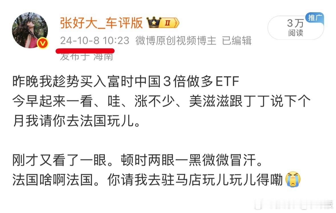 历经13个月,我上三倍杠杆买的做多中国终于涨到了我最初的买点。啊,你们看到我第一个重仓操作了吗。我被撂在高高的孤傲的山顶上。凛冽的山风刮得我脸疼不知道丁丁还记不记得我说炒股赚钱了就请她去法国大玩特玩的事情。果然太美的承诺还是因为太年轻。