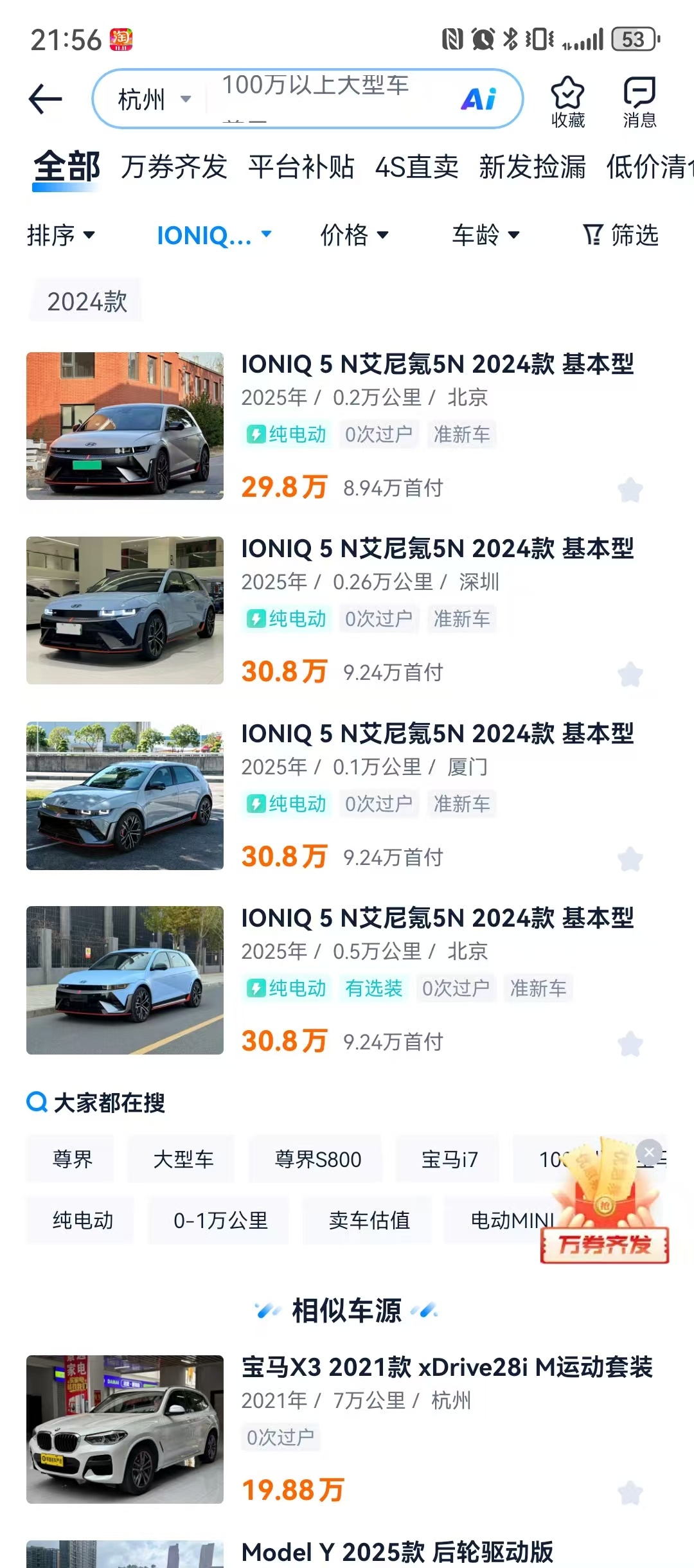 缺钱了,得卖车了,我的现代IONIQ 5 N,2024年12月25上牌,1.18万公里,0过户,原漆,带车衣,换了个赞助商迈拓的竞技刹车,原厂刹车应该还在的,但不保证一定能找到。下面这些照片,就是刚刚洗干净实拍的,不是我刚提车拍的新车照片。成色确实很新,因为我其他京牌车,卖的卖,发纽北的发纽北,这台5N除了刚提车的时候,去做了一个浙赛的节目,其他时候就是在北京代步。我刚提车那会儿,跑了一下浙赛,用原厂胎1分41.9,用米其林Cup2R刷了1分38.0,有懂浙赛圈速概念的朋友,可以给大家科普一下,总之作为一台SUV来说,确实强得有点可怕了。这台车,貌似好像也不用科普,很小众冷门的一台性能SUV,大多数人连认识都不认识,它注定不会是大多数朋友会选择的家用车,虽然我个人觉得它家用属性真的比很多人想的强多了。不过这车确实只属于那些本身就很喜欢这车,但当年没买的朋友。我查了一下,全网目前这车的二手车,貌似一共就4台,标价如图2。我确实缺钱了,来个能打钱的,价格好说,车在北京,随时能过户。