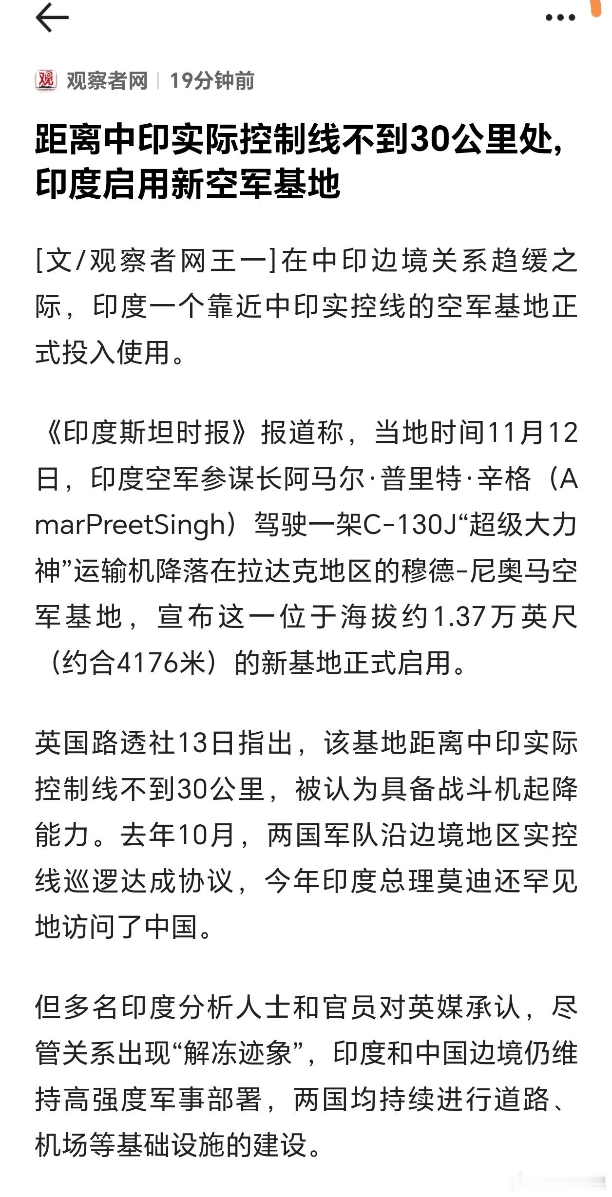 印度刚刚启用的新空军基地,距离中印实际控制线不到30公里处。继续惠印吧,给签证,优待印度留学生吧,越惠,印度越以为你怕他……