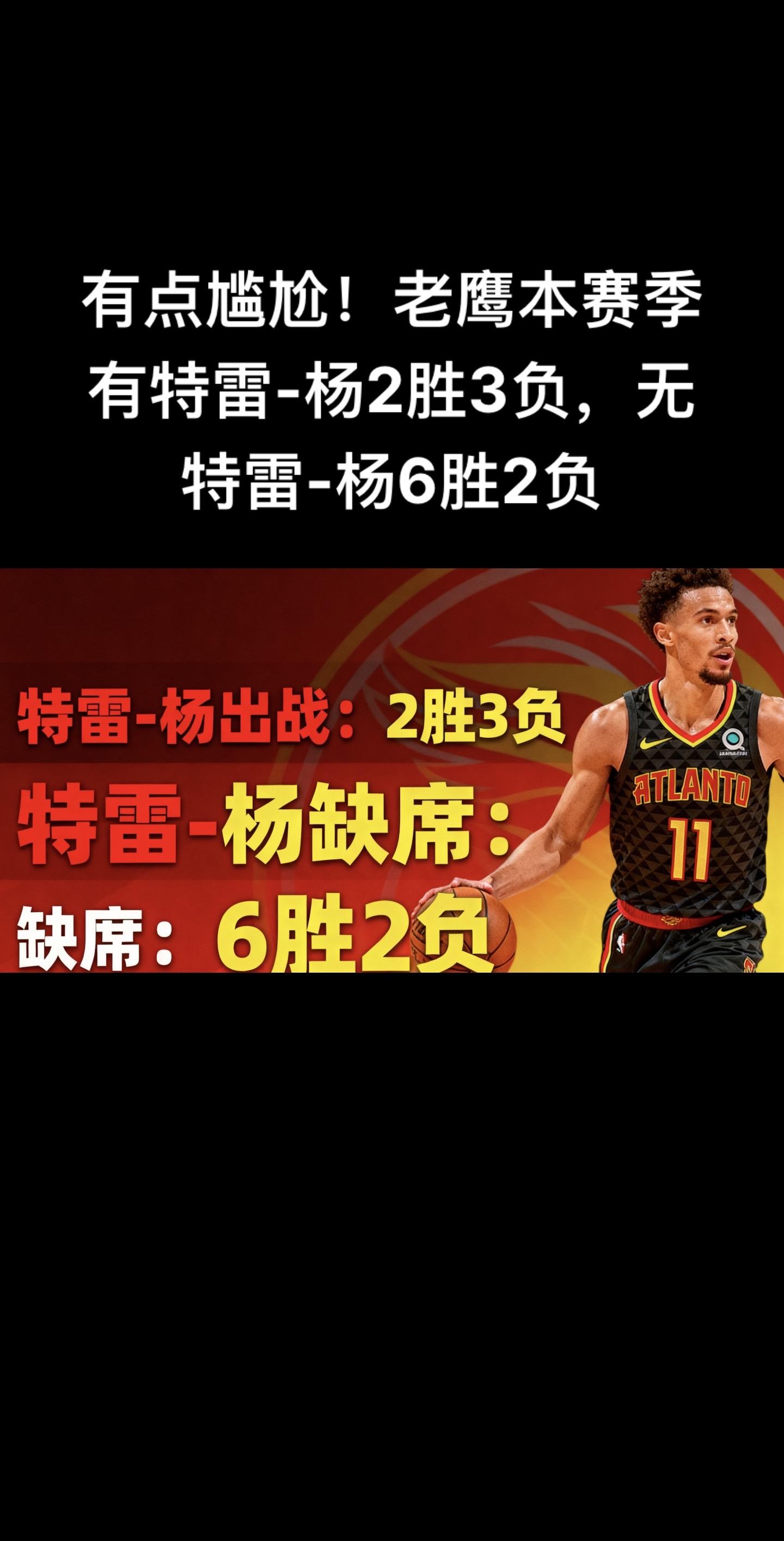 本赛季老鹰队在特雷-杨出战时仅取得2胜3负,而他缺席的比赛中反而打出6...