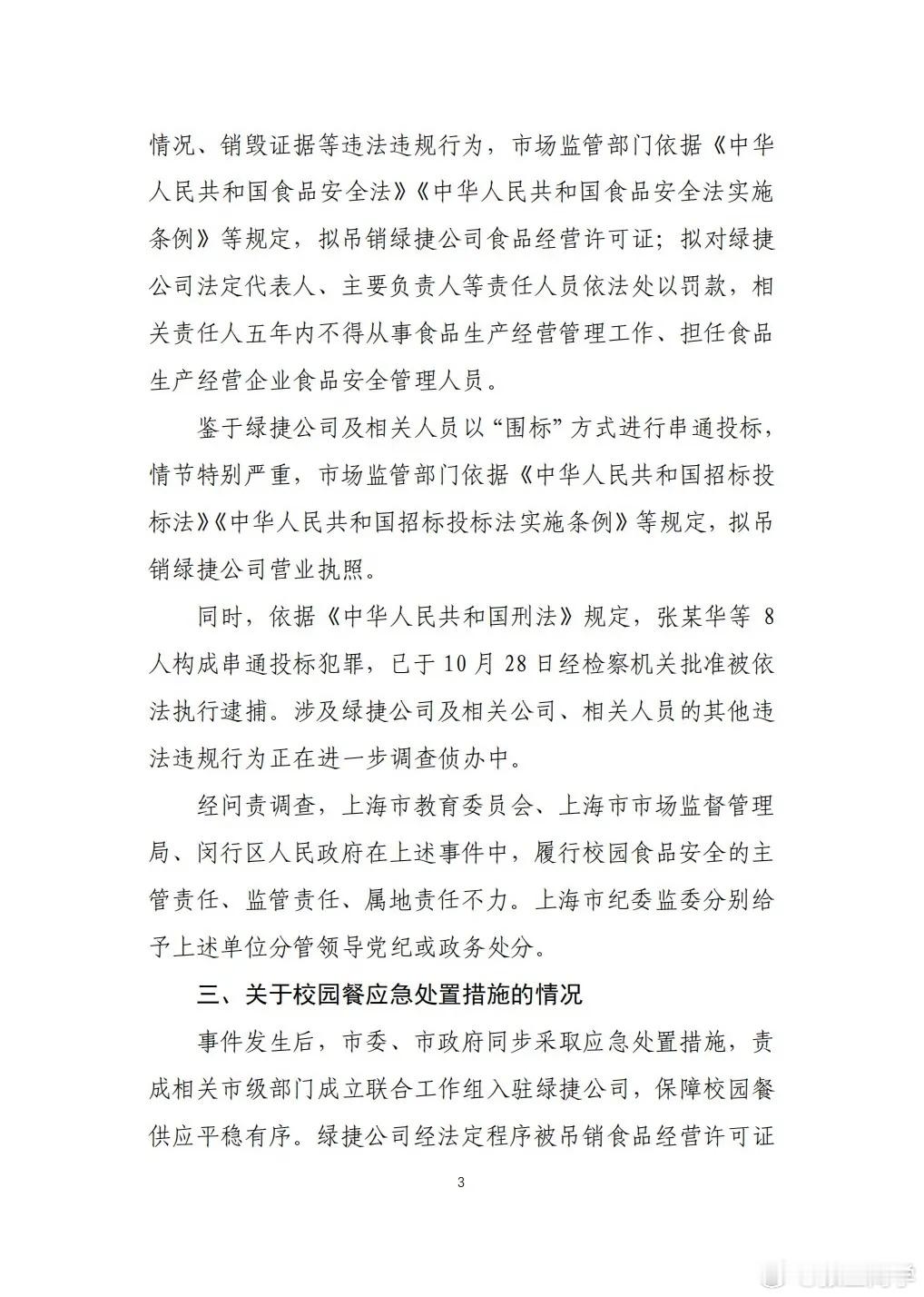 上海小学臭“虾仁炒蛋”事件,绿捷公司8人因串通投标罪被检察机关批捕。1、绿捷有组织地统一口径、提供虚假情况销毁证据等违法违规行为,依法吊销绿捷食品经营许可证。2、绿捷以“围标”方式进行串通投标,情节特别严重,拟吊绿捷销营业执照。3、绿捷公司实际控制人张某华等8人,构成串通投标罪,已被检察机关批准逮捕。(非法中标86个校园餐饮服务项目)