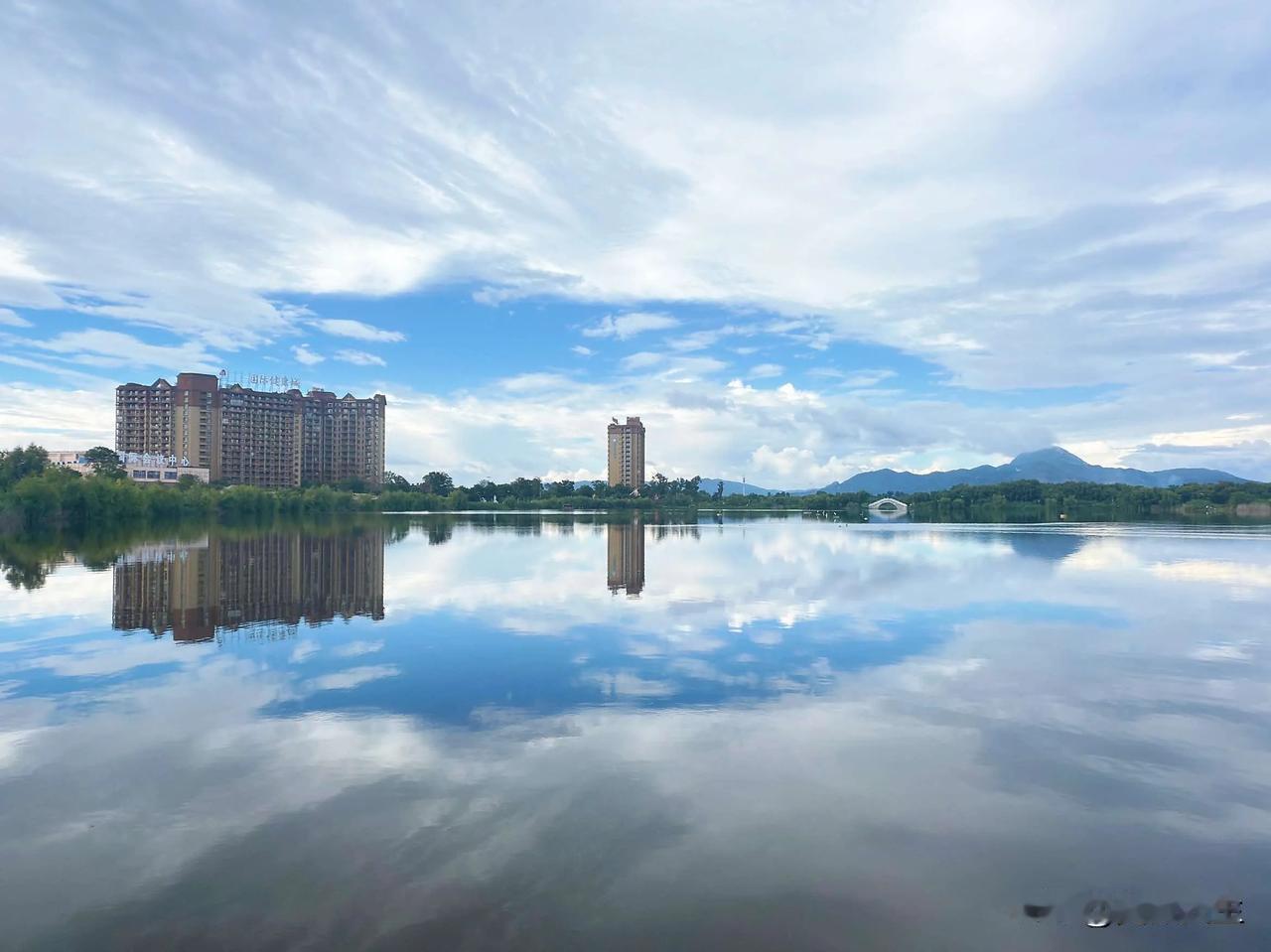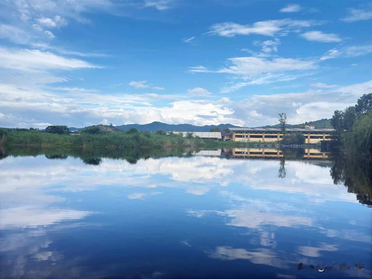 极目远眺,湖面如镜,倒映着苍穹的云影,水天一体泛起淡淡的雾霭,仿佛世界的边界在此消融。