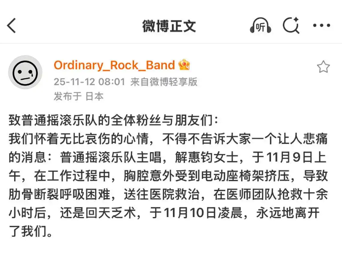 11月12日,有独立乐队在社交平台上发布讣告,称该乐队主唱解惠钧(艺名阿珍)于11月9日上午,在工作过程中,胸腔意外受到电动座椅架挤压,导致肋骨断裂呼吸困难,被送往医院救治。