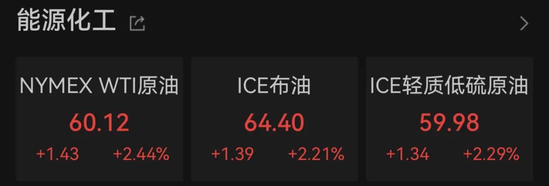 其他市场方面,国际油价大涨,截至发稿,NYMEXWTI原油、ICE布油均涨超2%。