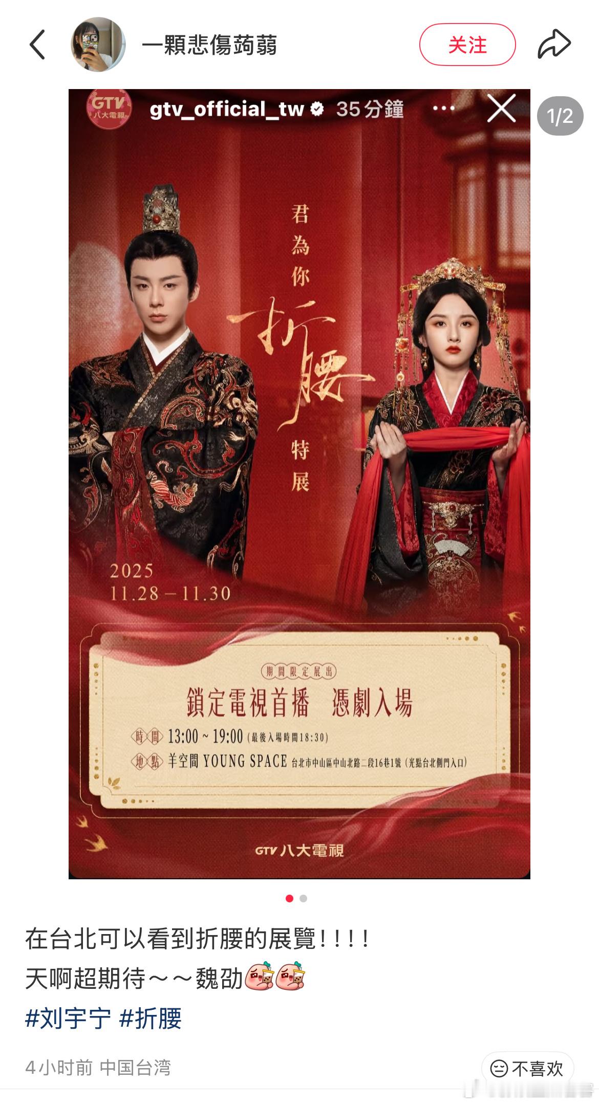 天啊刘宇宁主演的折腰和魏劭真是持续发光发热台湾台北还给折腰办了展览好争气啊