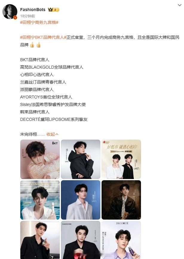解锁首个商务九宫格里程碑!田栩宁仅用三个月实现商务跨越式成长,多品牌加持见证市场认可度。