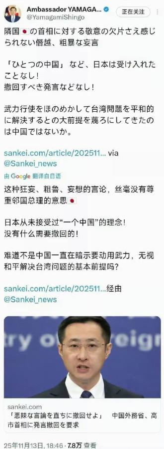 中日关系因高市早苗此前涉台言论,再次变得紧张了起来,在中国明确警告日本勿要玩火的背景下,日本方面很多人破防,直接索性不装了,公然与中国摊牌。 日本防卫大臣小泉进次郎在11月14日再次叫嚣:日本自卫队将确保台湾海峡和平稳定!日本前驻澳大利亚大使更是扬言,日本从未接受过“一个中国”原则,没什么要撤回的! 除此之外,大阪市议会在11月14号正式通过决议,要求中国驻大阪总领事薛剑就X上发表的言论道歉,称“此举给人以煽动民众焦虑之感,严重损害了我们迄今为止建立的友好关系,不容忽视”。 所以通过以上日本方面的一些言论和行为能够看的出来,他们是真的没有一丁点忏悔的意思,也根本没有意识到自己错了。 因此对于日本的一贯尿性,还是中国驻大阪总领事薛剑了解的比较清楚,而对待小日子最好的方式,就是薛剑总领事此前所说的那一句,“只能毫不犹豫地斩掉那擅自闯入的肮脏头颅。你已经做好心理准备了吗?” 结合目前中日两国关系的紧张,外交部这边已经于11月14日发文,提醒中国公民近期避免前往日本!并且在内容中还明确写道:近日,日本领导人公然发表涉台露骨挑衅言论,严重恶化中日人员交流氛围,给在日中国公民人身和生命安全带来重大风险。 对于日本,中国从上而下的态度都是统一且坚决的,所以且看日本还能嘴硬到什么时候。在我们看来,只要日本首相高市早苗不撤回此前涉台恶劣言论,不为自己的言行向中国歉意,并做出承诺,这事就没完!