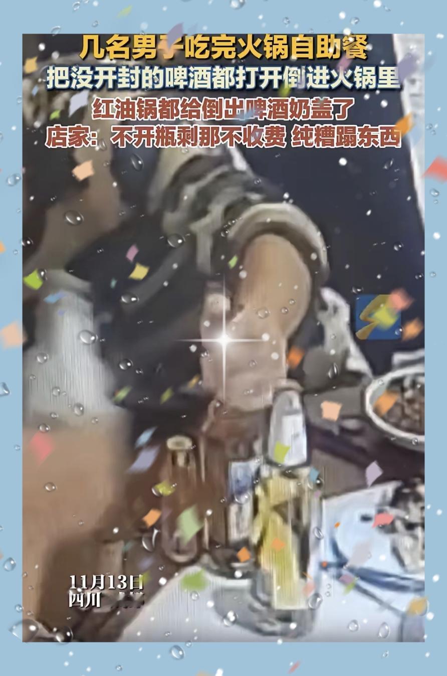 四川成都,几名男子去吃火锅自助,可酒足饭饱准备离开时,却把未开封的啤酒全给打开,然后倒进了火锅里面,店家事后查看监控被气得不轻,直接把视频发到了网上。网友:这就是浪费粮食! 监控里看得清楚,几个人分工明确,有人负责开瓶,有人负责倒酒。咕咚咕咚,八九瓶啤酒全进了火锅,锅底都快溢出来了。他们倒得干脆,倒完了抹嘴就走。 店主是后来收拾时才发现不对劲,锅底飘着啤酒沫,底下沉着好几个瓶盖。这才调了监控看,一看就火了。这些酒要是没开封,本来是可以退的,现在全浪费了。 说实话,这已经不是简单的“浪费”了,而是一种带着恶意的破坏。他们不是喝不下,也不是想尝尝啤酒锅底的味道,就是明摆着把东西打开,让店家没法退回去。用难听点的话说,这种操作不是糊涂,是给人添堵,是连基本的边界感和尊重都没有。 自助餐的规则是“按需取用”,不是“按需糟蹋”。你付的钱是为了自己享用,不是为了给别人制造麻烦。这几位的做法,既让店家受了损失,也触动了大家对浪费粮食的反感底线。 说到底,出门吃饭图个开心,但开心不等于任性。真正的痛快,是吃得满足、走得心安,不给别人添堵,也不给自己留话柄。一桌人围着火锅,本该是热热闹闹的,最后却以这样一出收场,实在是够丢人的。 你怎么看待这种行为?如果你是店家,会怎么处理?欢迎在评论区聊聊。