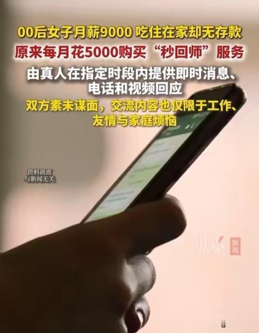 00后女子月薪900,吃住在家里却无存款,这个工资也不低,就算买化妆品也应该存下一些;原来女子每个月花5000购买“秒回师”服务,大家有听过吗? 有点孤陋寡闻了,第一个听说“秒回师”,真的有那么多人需要找“秒回师”这种吗?在指定时间段提供即时消息、电话和视频回应,没有见过面。 这种是不是没有啥朋友,但是又想有人陪伴,心灵上一种慰藉。 花这么多找这种秒回复的,个人觉得有些不理智了,还是找个朋友一起聚聚比较好。 大家怎么看待这件事呢?