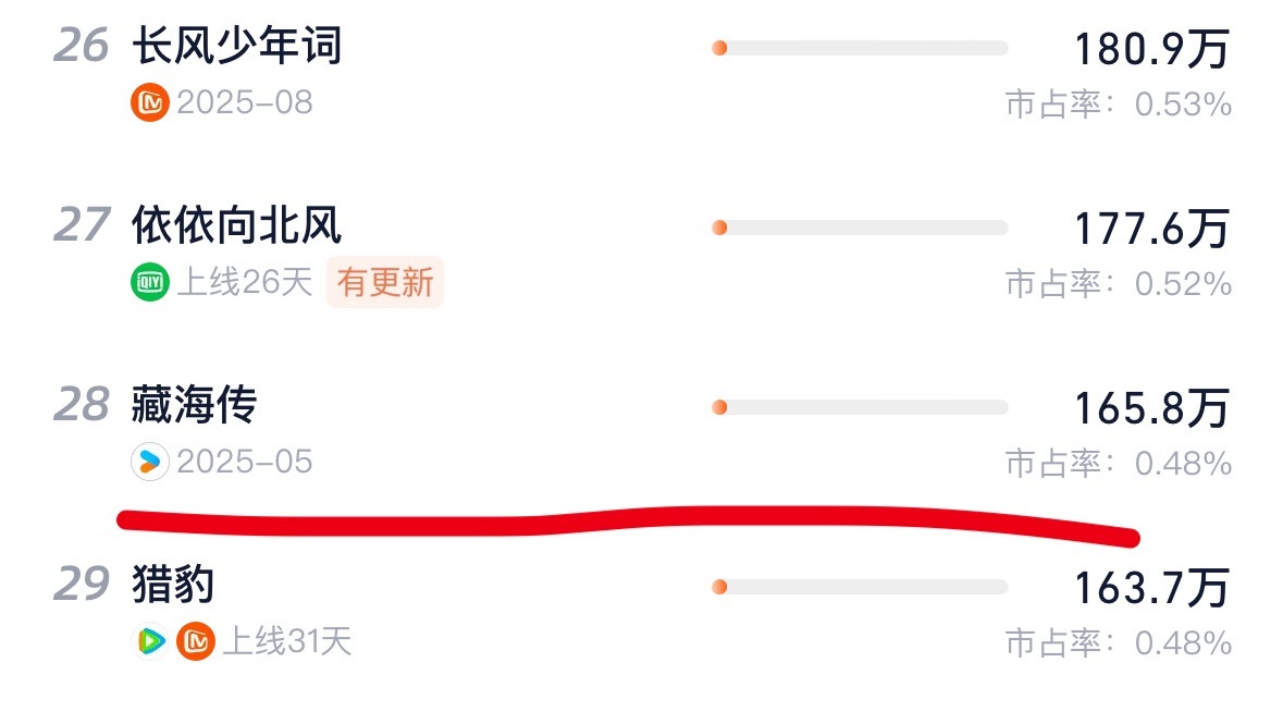 肖战《藏海传》播出还不到半年,就进入了👖的N刷榜了,N刷榜一般都是经典口碑长尾老剧。5月开播,灯塔直到昨天还没下榜,今天给强制下榜了。