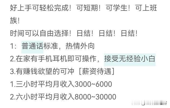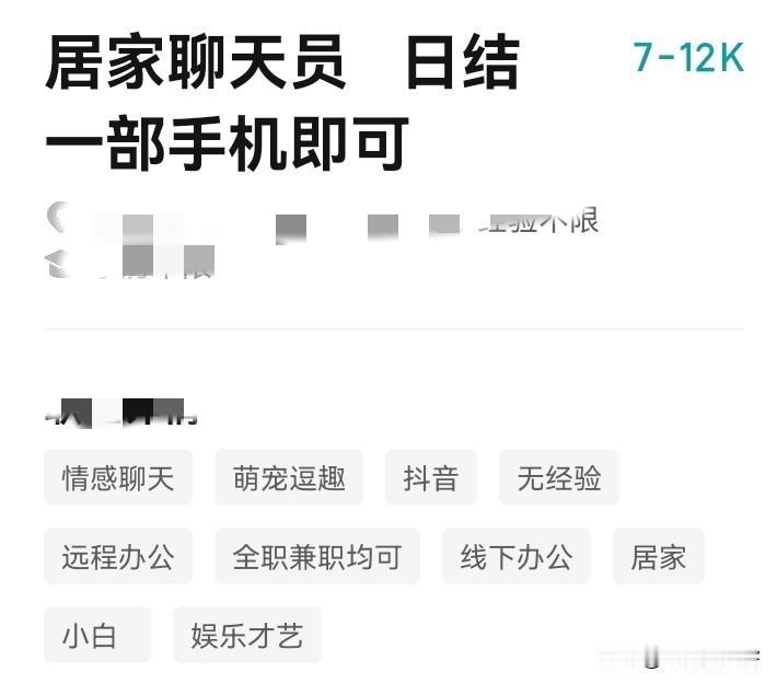 警惕!无门槛居家聊天员月入过万?背后套路太脏了! 家人们谁懂啊!找工作时刷到个“神仙岗位”——居家聊天员,不用学历、不用经验,会说普通话、有部手机就行,每天聊3-6小时,轻松月入6000+,甚至能破万! 当时我还天真以为是天降馅饼,结果一入职开始培训,瞬间看清真面目!所谓“聊天赚钱”,根本不是简单唠嗑,而是让你发语音钓男生,加好友后私下诱导打赏。 可平白无故谁会给陌生人砸钱啊?说白了,这就是个幌子!后续不就是逼着你露脸、搞擦边、甚至做色情相关的事吗?能不能赚钱全看你“放不放得开”,完全是踩着法律和道德底线在捞钱!我培训还没有开始就马上退出了。 有没有人找过这种工作?你们觉得真有人会单纯聊天就打赏吗?遇到这种无门槛高收入的岗位,一定要多留个心眼! 大家是不是也认为钱从天上掉下来呢?