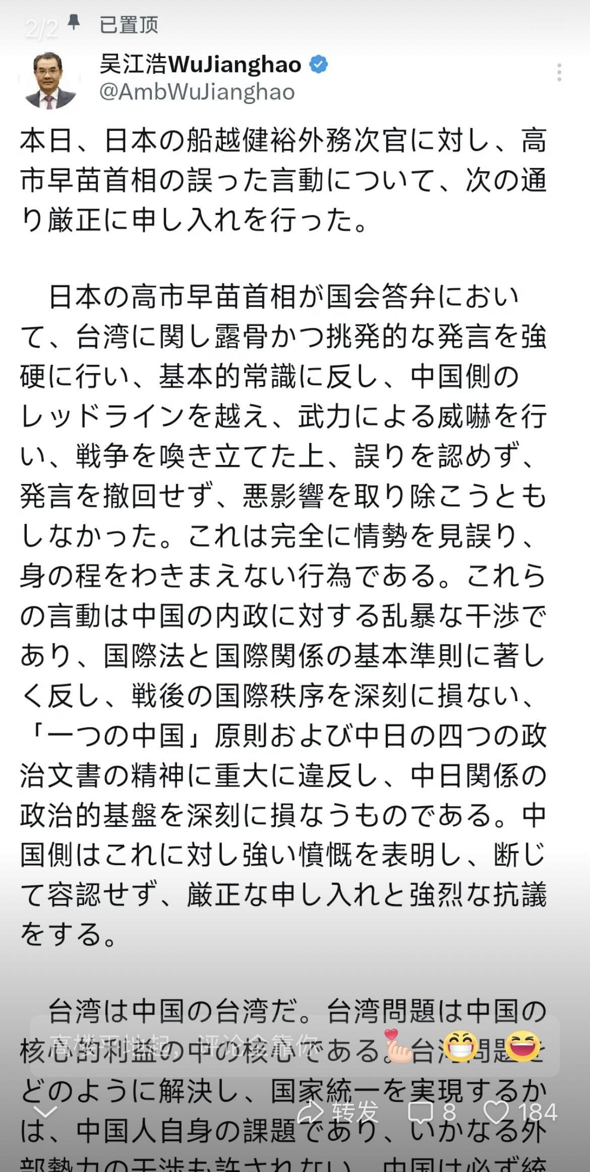 吴江浩大使这通双语严正表态,直接把日本政客的嚣张气焰怼回去了!高市早苗在国会公然叫嚣武力介入 台海,还拒不认错,这哪是外交言辞,分明是没睡醒的战争狂言。别忘了今年是台湾光复80周年,日本当年在台的殖民罪行罄竹难书,现在居然还敢染指台湾问题,简直是好了伤疤忘了疼。 中方的表态里藏着硬气:现在的中国早不是任人拿捏的年代,敢武力介入就是侵略,必遭迎头痛击!日本政客绑上“台独”战车,纯属自寻死路。 你觉得日方会收敛挑衅,还是继续在危险边缘试探?