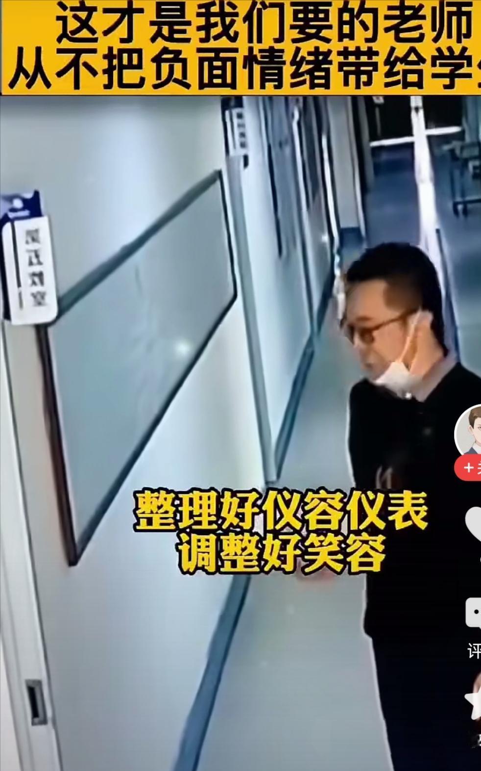 这个视频很让人为这个老师动容,进教室之前,调整好自己的情绪,强颜欢笑,不把自己悲观的情绪传染给学生。这样的老师太少了! 这也不能怪老师,不是每一个老师都能强颜欢笑,故作镇定的。不得不说老师的心情很重要,一个人可以影响一个班。所以给老师营造一个轻松愉快的工作环境,非常重要。一个开心快乐的老师,才可以去影响学生,让学生们也有一个活泼快乐的心情上课。老师 治愈系女老师 暖心女老师 老师心累瞬间 老师说话很精彩