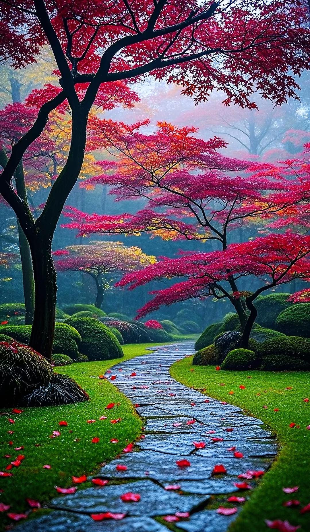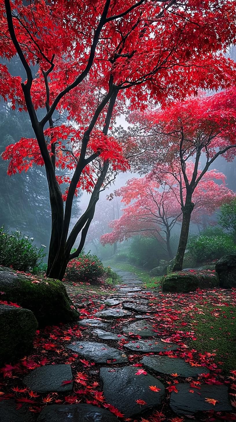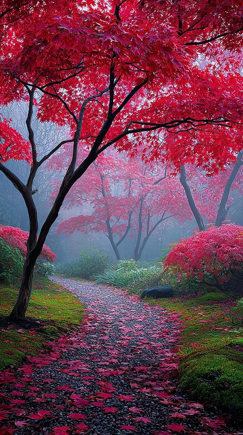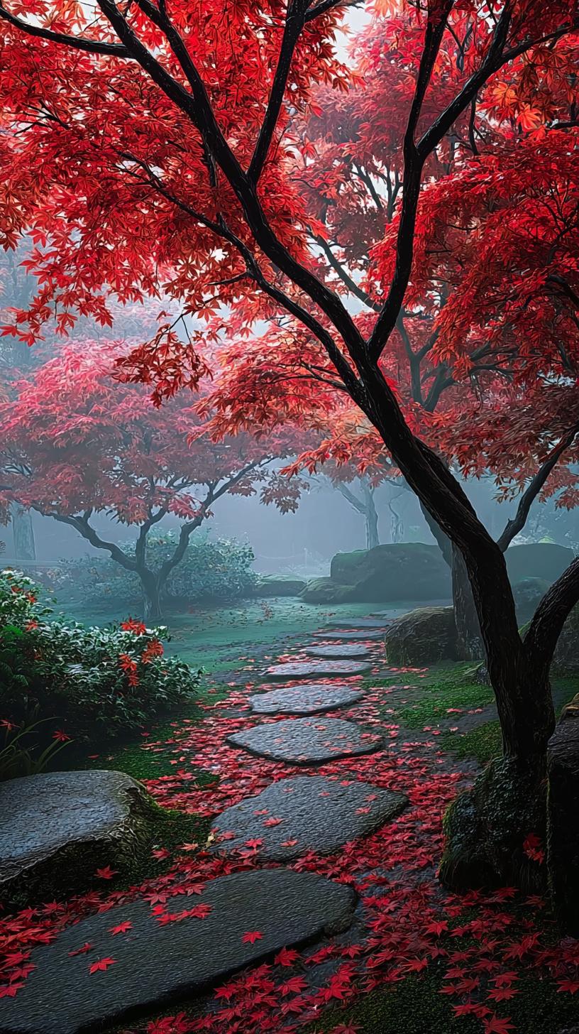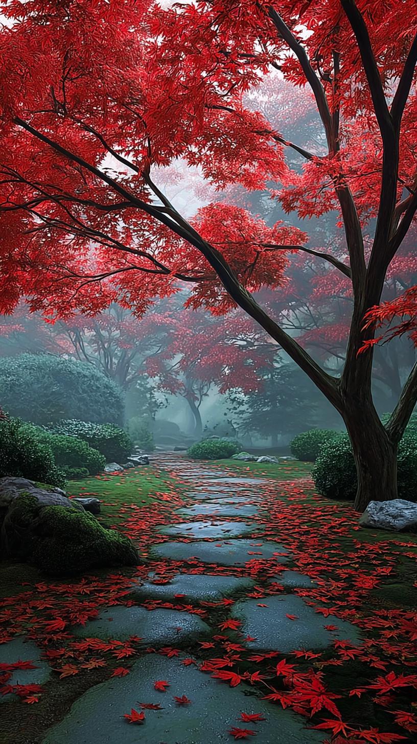 秋意浓,红叶漫山,漫步在雾中石径,感受大自然的静谧与美丽。🍁🍂🍃